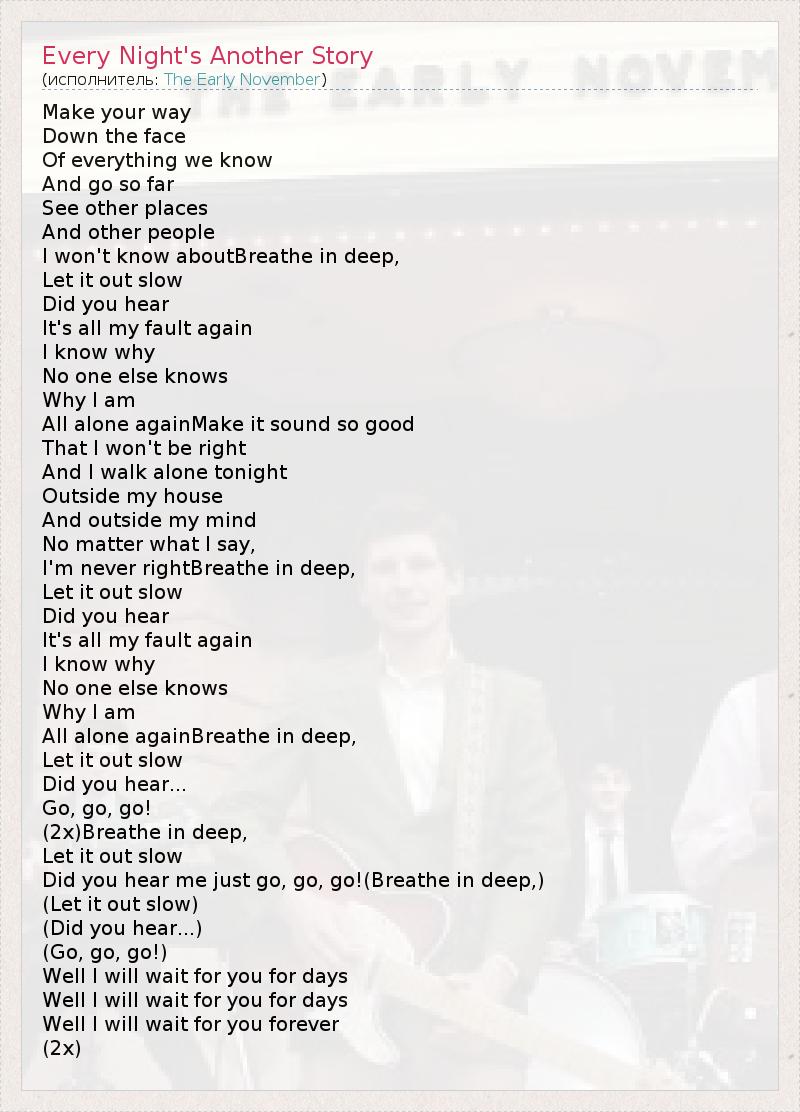 Make your way Down the face Of everything we know And go so far See other places And other people I won't know aboutBreathe in deep, Let it out slow Did you hear It's all my fault again I know why No one else knows Why I am All alone againMake it sound so good That I won't be right And I walk alone tonight Outside my house And outside my mind No matter what I say, I'm never rightBreathe in deep, Let it out slow Did you hear It's all my fault again I know why No one else knows Why I am All alone againBreathe in deep, Let it out slow Did you hear... Go, go, go! (2x)Breathe in deep, Let it out slow Did you hear me just go, go, go!(Breathe in deep,) (Let it out slow) (Did you hear...) (Go, go, go!) Well I will wait for you for days Well I will wait for you for days Well I will wait for you forever (2x)