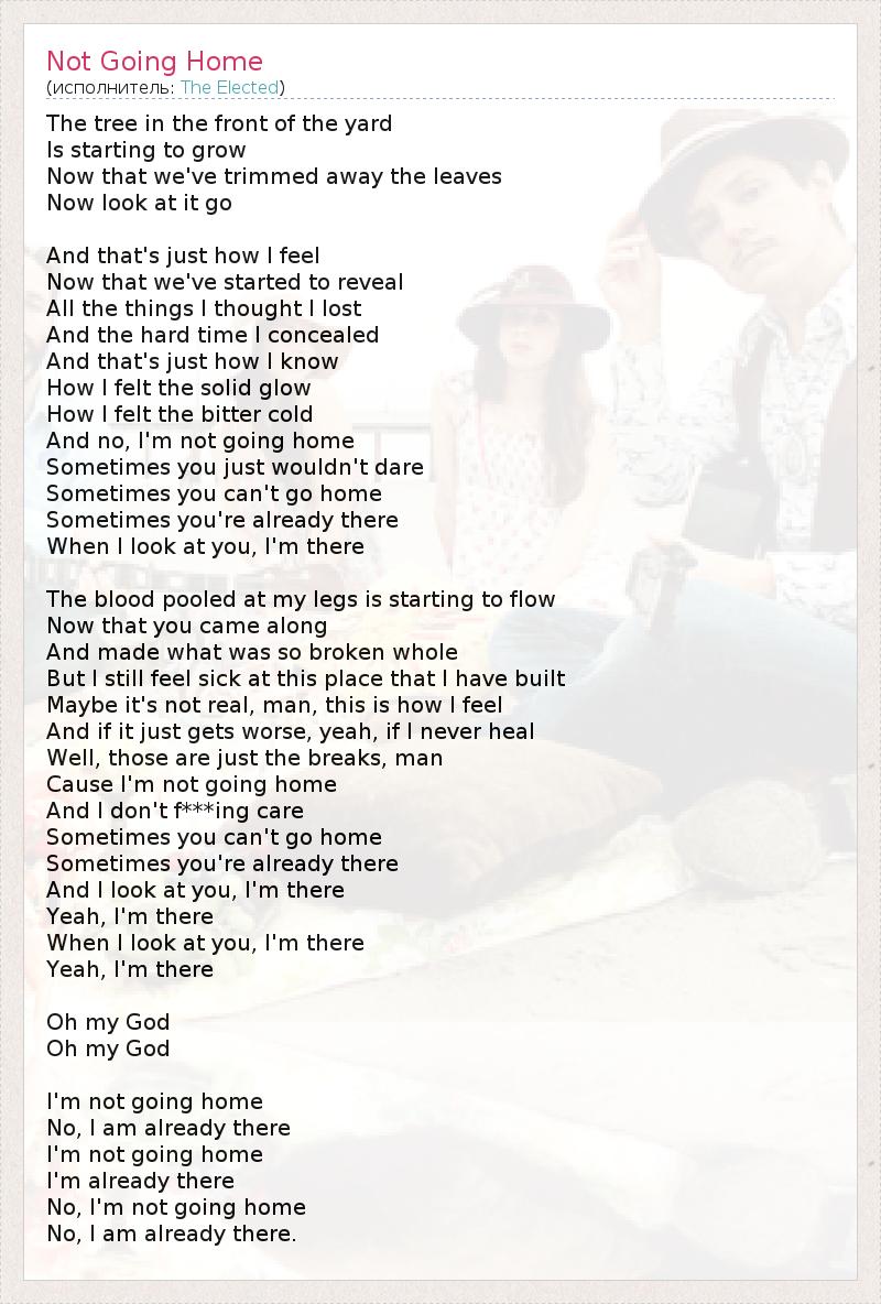 The tree in the front of the yard Is starting to grow Now that we've trimmed away the leaves Now look at it go And that's just how I feel Now that we've started to reveal All the things I thought I lost And the hard time I concealed And that's just how I know How I felt the solid glow How I felt the bitter cold And no, I'm not going home Sometimes you just wouldn't dare Sometimes you can't go home Sometimes you're already there When I look at you, I'm there The blood pooled at my legs is starting to flow Now that you came along And made what was so broken whole But I still feel sick at this place that I have built Maybe it's not real, man, this is how I feel And if it just gets worse, yeah, if I never heal Well, those are just the breaks, man Cause I'm not going home And I don't f***ing care Sometimes you can't go home Sometimes you're already there And I look at you, I'm there Yeah, I'm there When I look at you, I'm there Yeah, I'm there Oh my God Oh my God I'm not going home No, I am already there I'm not going home I'm already there No, I'm not going home No, I am already there.