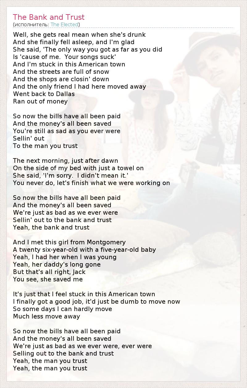 А как ты думаешь, о чем песня "The Bank and Trust" ?