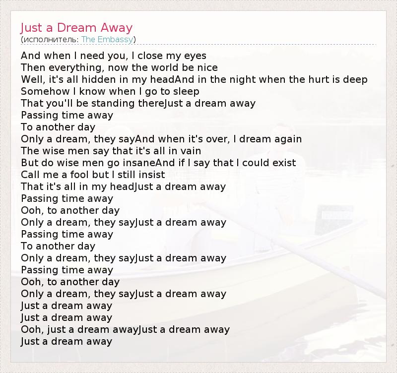 And when I need you, I close my eyes Then everything, now the world be nice Well, it's all hidden in my headAnd in the night when the hurt is deep Somehow I know when I go to sleep That you'll be standing thereJust a dream away Passing time away To another day Only a dream, they sayAnd when it's over, I dream again The wise men say that it's all in vain But do wise men go insaneAnd if I say that I could exist Call me a fool but I still insist That it's all in my headJust a dream away Passing time away Ooh, to another day Only a dream, they sayJust a dream away Passing time away To another day Only a dream, they sayJust a dream away Passing time away Ooh, to another day Only a dream, they sayJust a dream away Just a dream away Just a dream away Ooh, just a dream awayJust a dream away Just a dream away
