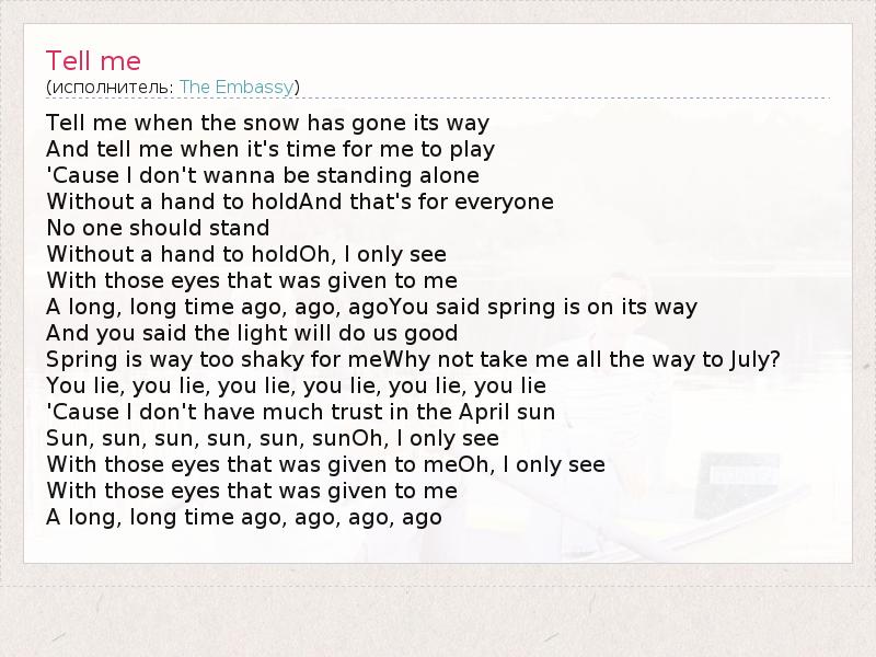 Tell me when the snow has gone its way And tell me when it's time for me to play 'Cause I don't wanna be standing alone Without a hand to holdAnd that's for everyone No one should stand Without a hand to holdOh, I only see With those eyes that was given to me A long, long time ago, ago, agoYou said spring is on its way And you said the light will do us good Spring is way too shaky for meWhy not take me all the way to July? You lie, you lie, you lie, you lie, you lie, you lie 'Cause I don't have much trust in the April sun Sun, sun, sun, sun, sun, sunOh, I only see With those eyes that was given to meOh, I only see With those eyes that was given to me A long, long time ago, ago, ago, ago