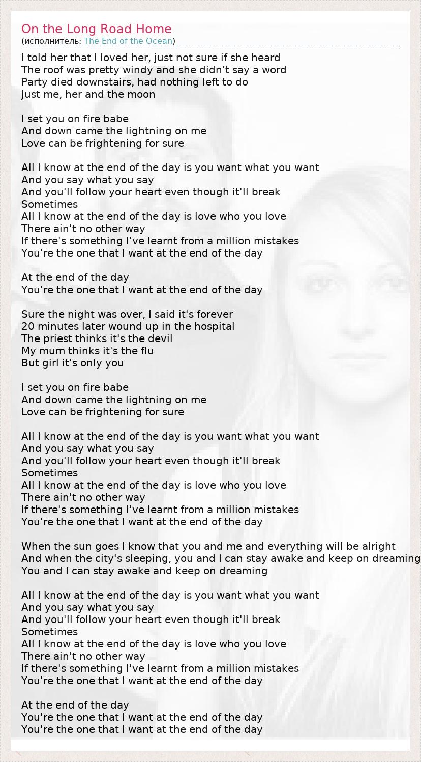 Я признался ей в любви, но не уверен, услышала ли она... На крыше было довольно ветрено, и она ничего не ответила. Внизу затихла вечеринка, и у нас не осталось выбора - Только я, она и луна. Я заставлю тебя вспыхнуть, детка, А затем пламя перекинется на меня. Безусловно, иногда любовь может приводить в ужас. По большому счёту я знаю одно: ты хочешь то, что хочешь, И говоришь то, что говоришь, И ты будешь слушать своё сердце, хотя оно будет разбиваться Иногда... По большому счёту я знаю одно: ты любишь того, кого любишь, Без вариантов. И если я что-то и понял после миллиона совершенных ошибок, то следующее: В конечном итоге я хочу быть лишь с тобой. В конечном итоге, В конечном итоге я хочу быть лишь с тобой. Уверенный, что ночь подошла к концу, я сказал: "Это навеки". Двадцать минут спустя я оказался в госпитале. Священник считает, что во всем виноват дьявол, Моя мать уверена, что у меня грипп, Но, детка, это всё ты! Я заставлю тебя вспыхнуть, детка, А затем пламя перекинется на меня, Безусловно, любовь может вызывать ужас. По большому счёту я знаю одно: ты хочешь то, что хочешь, И говоришь то, что говоришь, И ты будешь слушать своё сердце, хотя оно будет разбиваться Иногда... По большому счёту я знаю одно: ты любишь того, кого любишь, Без вариантов. И если я что-то и понял после миллиона совершенных ошибок, то следующее: В конечном итоге я хочу быть лишь с тобой. На закате солнце я знаю, что у нас с тобой всё будет в порядке. И когда город закроет глаза, мы с тобой не заснём, мы будем мечтать дальше, Мы с тобой не заснем, мы будем мечтать дальше! По большому счёту я знаю одно: ты хочешь то, что хочешь, И говоришь то, что говоришь, И ты будешь слушать своё сердце, хотя оно будет разбиваться Иногда... По большому счёту я знаю одно: ты любишь того, кого любишь, Без вариантов. И если я что-то и понял после миллиона совершенных ошибок, то следующее: В конечном итоге я хочу быть лишь с тобой. В конечном итоге, В конечном итоге я хочу быть лишь с тобой. В конечном итоге я хочу быть лишь с тобой.
