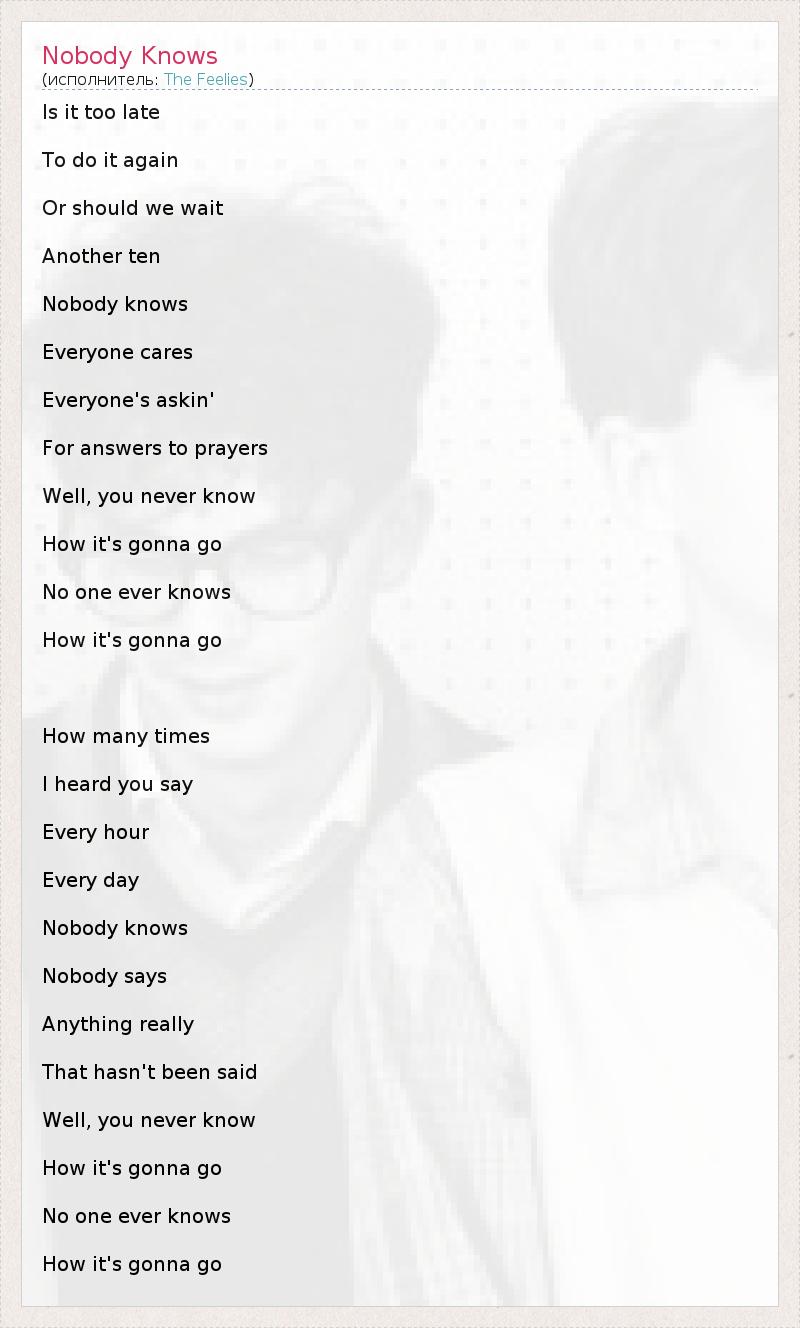 Is it too late To do it again Or should we wait Another ten Nobody knows Everyone cares Everyone's askin' For answers to prayers Well, you never know How it's gonna go No one ever knows How it's gonna go How many times I heard you say Every hour Every day Nobody knows Nobody says Anything really That hasn't been said Well, you never know How it's gonna go No one ever knows How it's gonna go