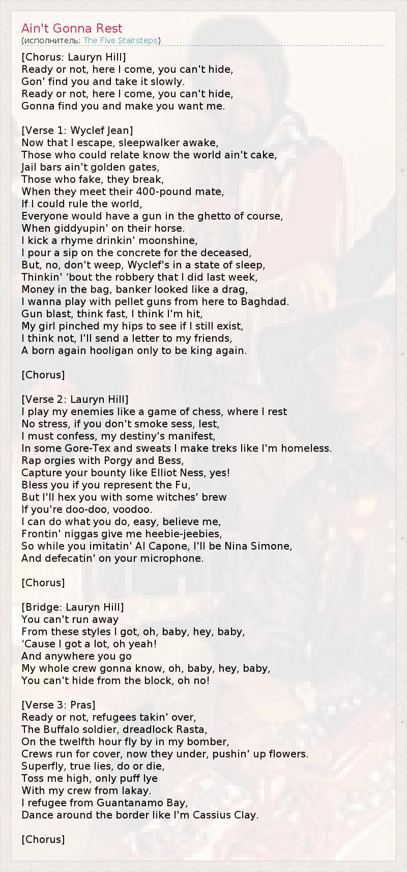 [Припев: Lauryn Hill] Готовы или нет, я иду, вам не спрятаться, Я найду вас и медленно возьму своё. Готовы или нет, я иду, вам не спрятаться, Я найду вас и заставлю захотеть меня. [Куплет 1: Wyclef Jean] Теперь я этого избежал, проснувшийся лунатик, Те, кто понимают, знают, что мир не пальцем делан, Тюремные решётки не золотые ворота, Притворщики, они сломаются, Когда познакомятся со своим стовосьмидесятикилограммовым сокамерником, Если бы я правил миром, То, конечно, каждый в гетто ходил бы с пистолетом, Понукая своих лошадей. Я выдаю рифмы, попивая самогон, Выливаю глоток на асфальт за почивших, Но, нет, не плачьте, Вайклеф просто спит, Думаю об ограблении, которое совершил на прошлой неделе, Деньги в сумке, банкир был похож на педика, Я хочу играть с дробовиками отсюда и до самого Багдада. Выпускаю пули, думаю быстро, кажется, я попадаю в цель, Моя девушка ущипнула меня за бедро, чтобы убедиться, что я всё ещё жив, Думаю, что нет, я пошлю письмо своим друзьям, Переродившийся хулиган, обречённый снова стать королём. [Припев] [Куплет 2: Lauryn Hill] Я обыгрываю врагов, будто в шахматы, там, где я отдыхаю — Никакого стресса, если ты не куришь дурь, тем не менее, Должна признаться: моя судьба — манифест, В "Гор-Тексе" и свитере я наматываю дороги, как бездомная. 1 Рэп-оргии с Порги и Бесс, 2 Захвачу ваши богатства, как Элиот Несс, да, 3 Спасибо, если ты поддерживаешь Фью, Но я околдую вас ведьминым варевом, Если ты отстой, то вуду. Я могу делать то же, что и вы, с лёгкостью, поверьте, Наглые ниггеры вызывают у меня раздражение, Так что пока вы изображаете Аль Капоне, я стану Ниной Симон, 4 И наложу кучу на ваш микрофон. [Припев] [Связка: Lauryn Hill] Вам не убежать От стилей, которыми я обладаю, о, детка, эй, детка, Потому что у меня их много, о да! И куда бы ты ни пошёл, Вся моя команда узнает об этом, о, детка, эй, детка, Тебе не укрыться от района, о нет! [Куплет 3: Pras] Готовы вы или нет, беженцы берут власть, Солдат буффало, растаман с дредами, 5 В последнюю минуту я пролетаю в своём бомбардировщике, Банды бегут в укрытие, а теперь из них растут цветы. Крутой, правдивая ложь, делай или сдохни, Бросьте мне дури, я смолю только план Со своей братвой из дома. Я беженец из залива Гуантанамо, Танцую вокруг границы, будто Кассиус Клей. 6 [Припев] 1 — Gore-Tex — мембранная ткань, производящаяся фирмой W. L. Gore & Associates. Применяется для изготовления специальной одежды и обуви. 2 — "Порги и Бесс" ― опера Джорджа Гершвина в четырёх актах и девяти картинах. 3 — Элиот Пол Несс — специальный агент министерства финансов США, которому удалось посадить гангстера Аль Капоне в тюрьму на 11 лет. 4 — Альфонсо Габриэль "Большой Аль" Капоне (1899–1947) — американский гангстер, действовавший в 1920–1930-х годах на территории Чикаго; под прикрытием мебельного бизнеса занимался бутлегерством, игорным бизнесом и сутенёрством. Нина Симон (1933–2003) — американская певица, пианистка, композитор, аранжировщица, придерживалась джазовой традиции, однако использовала самый разный исполняемый материал, сочетала джаз, соул, поп-музыку, госпел и блюз, записывала песни с большим оркестром. 5 — Буффало — неформальное прозвание военнослужащих 10-го кавалерийского полка в армии Соединённых Штатов, сформированного 21 сентября 1866 года в Форт-Ливенуорте, штат Канзас, и целиком состоявшего из солдат-афроамериканцев. 6 — Кассиус Клей — имя, данное при рождении знаменитом