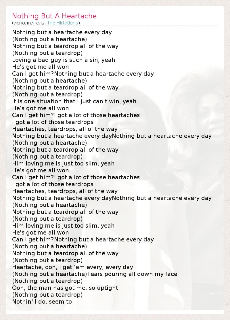 Nothing but a heartache every day (Nothing but a heartache) Nothing but a teardrop all of the way (Nothing but a teardrop) Loving a bad guy is such a sin, yeah He's got me all won Can I get him?Nothing but a heartache every day (Nothing but a heartache) Nothing but a teardrop all of the way (Nothing but a teardrop) It is one situation that I just can't win, yeah He's got me all won Can I get him?I got a lot of those heartaches I got a lot of those teardrops Heartaches, teardrops, all of the way Nothing but a heartache every dayNothing but a heartache every day (Nothing but a heartache) Nothing but a teardrop all of the way (Nothing but a teardrop) Him loving me is just too slim, yeah He's got me all won Can I get him?I got a lot of those heartaches I got a lot of those teardrops Heartaches, teardrops, all of the way Nothing but a heartache every dayNothing but a heartache every day (Nothing but a heartache) Nothing but a teardrop all of the way (Nothing but a teardrop) Him loving me is just too slim, yeah He's got me all won Can I get him?Nothing but a heartache every day (Nothing but a heartache) Nothing but a teardrop all of the way (Nothing but a teardrop) Heartache, ooh, I get 'em every, every day (Nothing but a heartache)Tears pouring all down my face (Nothing but a teardrop) Ooh, the man has got me, so uptight (Nothing but a teardrop) Nothin' I do, seem to
