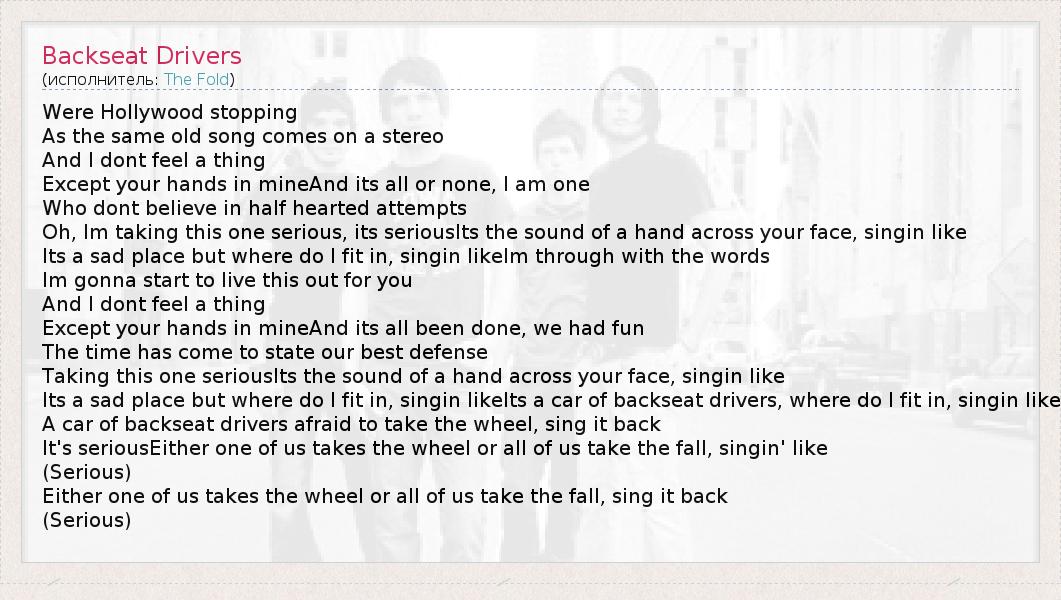 Were Hollywood stopping As the same old song comes on a stereo And I dont feel a thing Except your hands in mineAnd its all or none, I am one Who dont believe in half hearted attempts Oh, Im taking this one serious, its seriousIts the sound of a hand across your face, singin like Its a sad place but where do I fit in, singin likeIm through with the words Im gonna start to live this out for you And I dont feel a thing Except your hands in mineAnd its all been done, we had fun The time has come to state our best defense Taking this one seriousIts the sound of a hand across your face, singin like Its a sad place but where do I fit in, singin likeIts a car of backseat drivers, where do I fit in, singin like A car of backseat drivers afraid to take the wheel, sing it back It's seriousEither one of us takes the wheel or all of us take the fall, singin' like (Serious) Either one of us takes the wheel or all of us take the fall, sing it back (Serious)