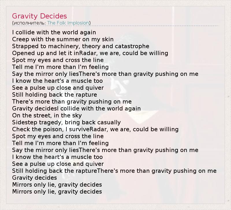 I collide with the world again Creep with the summer on my skin Strapped to machinery, theory and catastrophe Opened up and let it inRadar, we are, could be willing Spot my eyes and cross the line Tell me I'm more than I'm feeling Say the mirror only liesThere's more than gravity pushing on me I know the heart's a muscle too See a pulse up close and quiver Still holding back the rapture There's more than gravity pushing on me Gravity decidesI collide with the world again On the street, in the sky Sidestep tragedy, bring back casually Check the poison, I surviveRadar, we are, could be willing Spot my eyes and cross the line Tell me I'm more than I'm feeling Say the mirror only liesThere's more than gravity pushing on me I know the heart's a muscle too See a pulse up close and quiver Still holding back the raptureThere's more than gravity pushing on me Gravity decides Mirrors only lie, gravity decides Mirrors only lie, gravity decides