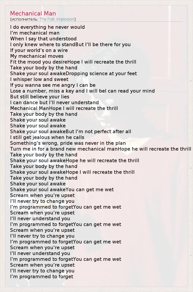 I do everything he never would I'm mechanical man When I say that understood I only knew where to standBut I'll be there for you If your world's on a wire My mechanical moves Fit the mood you desireHope I will recreate the thrill Take your body by the hand Shake your soul awakeDropping science at your feet I whisper low and sweet If you wanna see me angry I can be Lose a number, miss a key and I will beI can read your mind But still believe your lies I can dance but I'll never understand Mechanical ManHope I will recreate the thrill Take your body by the hand Shake your soul awake Shake your soul awake Shake your soul awakeBut I'm not perfect after all I still get jealous when he calls Something's wrong, pride was never in the plan Turn me in for a brand new mechanical manHope he will recreate the thrill Take your body by the hand Shake your soul awakeHope he will recreate the thrill Take your body by the hand Shake your soul awakeHope I will recreate the thrill Take your body by the hand Shake your soul awake Shake your soul awakeYou can get me wet Scream when you're upset I'll never try to change you I'm programmed to forgetYou can get me wet Scream when you're upset I'll never understand you I'm programmed to forgetYou can get me wet Scream when you're upset I'll never try to change you I'm programmed to forgetYou can get me wet Scream when you're upset I'll never understand you I'm programmed to forgetYou can get me wet Scream when you're upset I'll never try to change you I'm programmed to forget