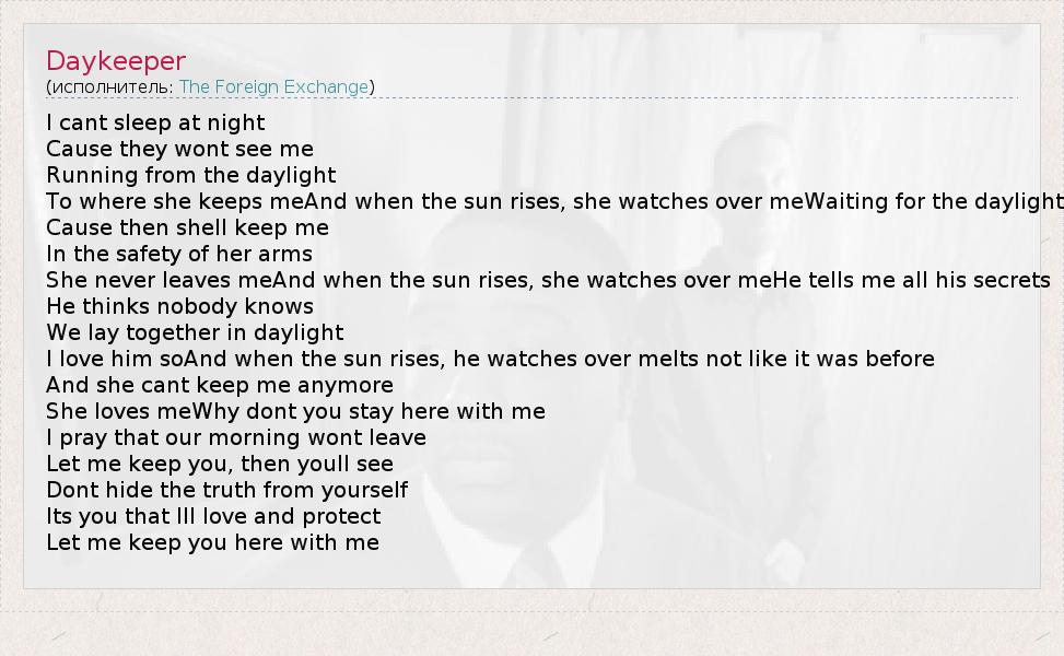 А как ты думаешь, о чем песня "Daykeeper" ?