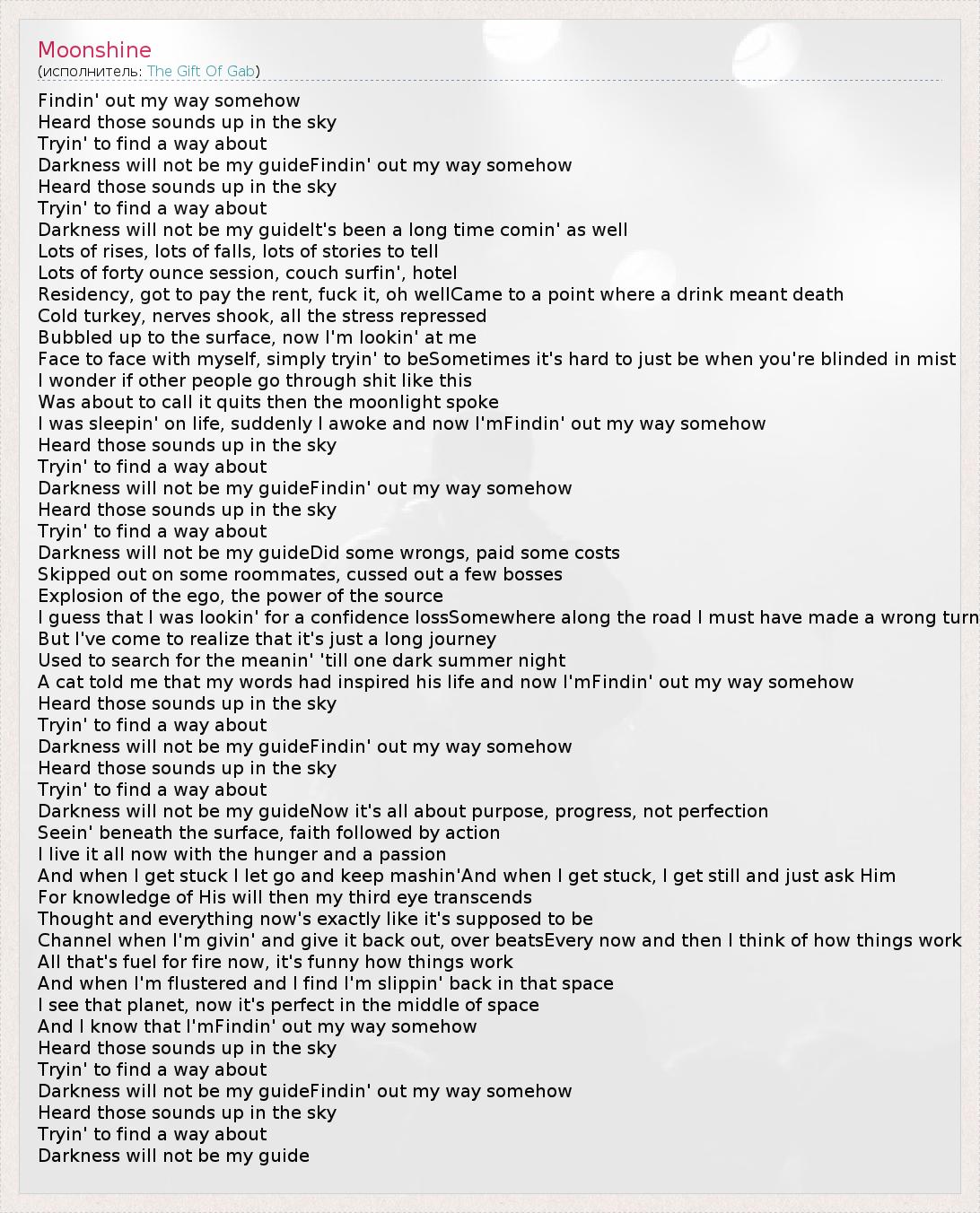 Findin' out my way somehow Heard those sounds up in the sky Tryin' to find a way about Darkness will not be my guideFindin' out my way somehow Heard those sounds up in the sky Tryin' to find a way about Darkness will not be my guideIt's been a long time comin' as well Lots of rises, lots of falls, lots of stories to tell Lots of forty ounce session, couch surfin', hotel Residency, got to pay the rent, fuck it, oh wellCame to a point where a drink meant death Cold turkey, nerves shook, all the stress repressed Bubbled up to the surface, now I'm lookin' at me Face to face with myself, simply tryin' to beSometimes it's hard to just be when you're blinded in mist I wonder if other people go through shit like this Was about to call it quits then the moonlight spoke I was sleepin' on life, suddenly I awoke and now I'mFindin' out my way somehow Heard those sounds up in the sky Tryin' to find a way about Darkness will not be my guideFindin' out my way somehow Heard those sounds up in the sky Tryin' to find a way about Darkness will not be my guideDid some wrongs, paid some costs Skipped out on some roommates, cussed out a few bosses Explosion of the ego, the power of the source I guess that I was lookin' for a confidence lossSomewhere along the road I must have made a wrong turn But I've come to realize that it's just a long journey Used to search for the meanin' 'till one dark summer night A cat told me that my words had inspired his life and now I'mFindin' out my way somehow Heard those sounds up in the sky Tryin' to find a way about Darkness will not be my guideFindin' out my way somehow Heard those sounds up in the sky Tryin' to find a way about Darkness will not be my guideNow it's all about purpose, progress, not perfection Seein' beneath the surface, faith followed by action I live it all now with the hunger and a passion And when I get stuck I let go and keep mashin'And when I get stuck, I get still and just ask Him For knowledge of His will then my third eye transcends Thought and everything now's exactly like it's supposed to be Channel when I'm givin' and give it back out, over beatsEvery now and then I think of how things work All that's fuel for fire now, it's funny how things work And when I'm flustered and I find I'm slippin' back in that space I see that planet, now it's perfect in the middle of space And I know that I'mFindin' out my way somehow Heard those sounds up in the sky Tryin' to find a way about Darkness will not be my guideFindin' out my way somehow Heard those sounds up in the sky Tryin' to find a way about Darkness will not be my guide