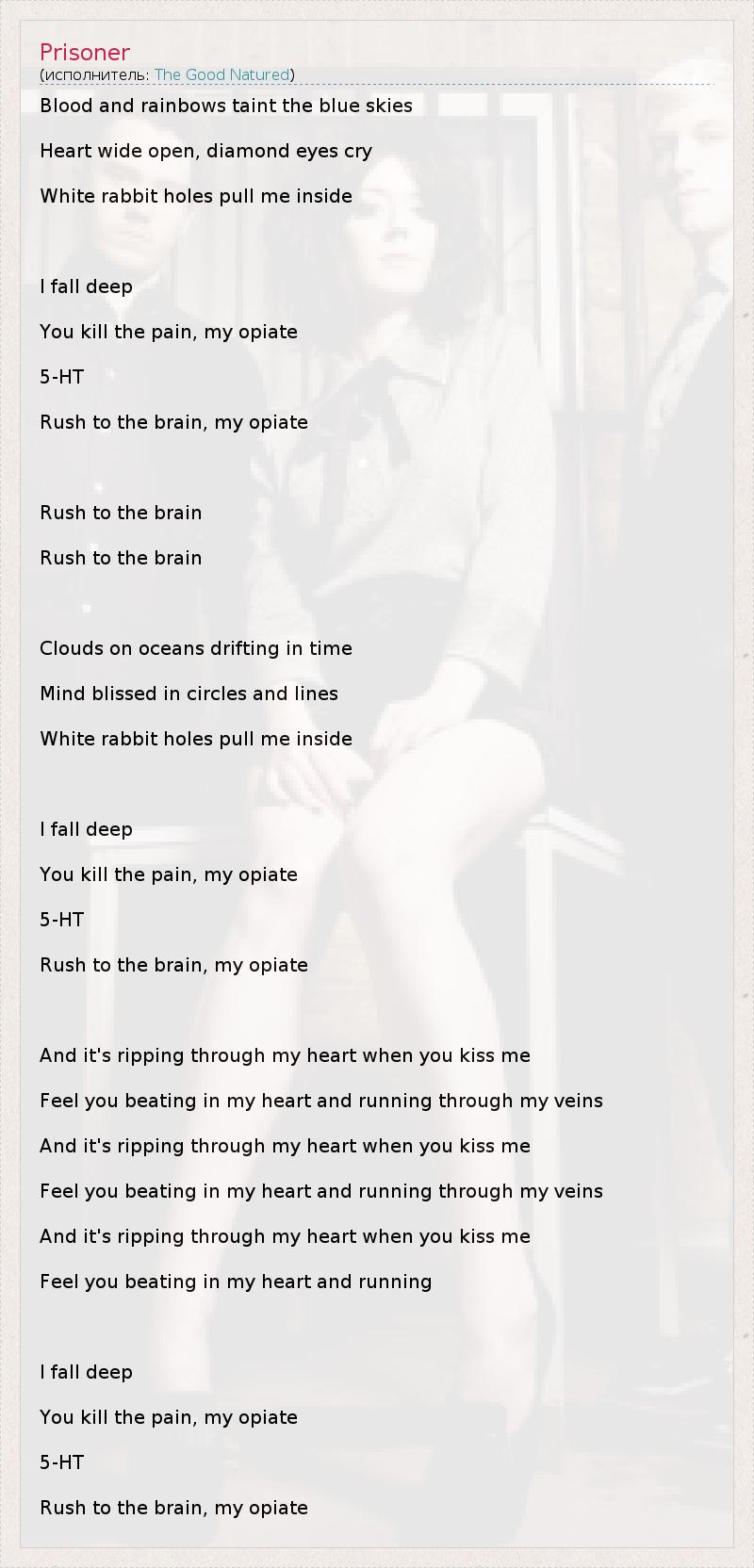 Blood and rainbows taint the blue skies Heart wide open, diamond eyes cry White rabbit holes pull me inside I fall deep You kill the pain, my opiate 5-HT Rush to the brain, my opiate Rush to the brain Rush to the brain Clouds on oceans drifting in time Mind blissed in circles and lines White rabbit holes pull me inside I fall deep You kill the pain, my opiate 5-HT Rush to the brain, my opiate And it's ripping through my heart when you kiss me Feel you beating in my heart and running through my veins And it's ripping through my heart when you kiss me Feel you beating in my heart and running through my veins And it's ripping through my heart when you kiss me Feel you beating in my heart and running I fall deep You kill the pain, my opiate 5-HT Rush to the brain, my opiate