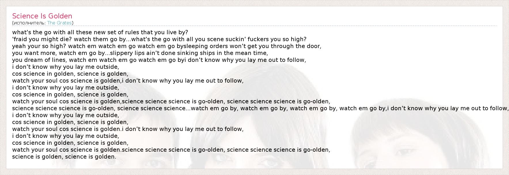 science science science is go-olden, science science science...watch em go by, watch em go by, watch em go by, watch em go by,i don't know why you lay me out to follow,