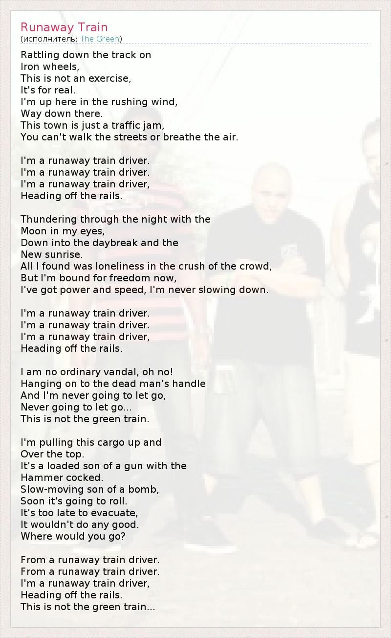 Rattling down the track on Iron wheels, This is not an exercise, It's for real. I'm up here in the rushing wind, Way down there. This town is just a traffic jam, You can't walk the streets or breathe the air. I'm a runaway train driver. I'm a runaway train driver. I'm a runaway train driver, Heading off the rails. Thundering through the night with the Moon in my eyes, Down into the daybreak and the New sunrise. All I found was loneliness in the crush of the crowd, But I'm bound for freedom now, I've got power and speed, I'm never slowing down. I'm a runaway train driver. I'm a runaway train driver. I'm a runaway train driver, Heading off the rails. I am no ordinary vandal, oh no! Hanging on to the dead man's handle And I'm never going to let go, Never going to let go... This is not the green train. I'm pulling this cargo up and Over the top. It's a loaded son of a gun with the Hammer cocked. Slow-moving son of a bomb, Soon it's going to roll. It's too late to evacuate, It wouldn't do any good. Where would you go? From a runaway train driver. From a runaway train driver. I'm a runaway train driver, Heading off the rails. This is not the green train...