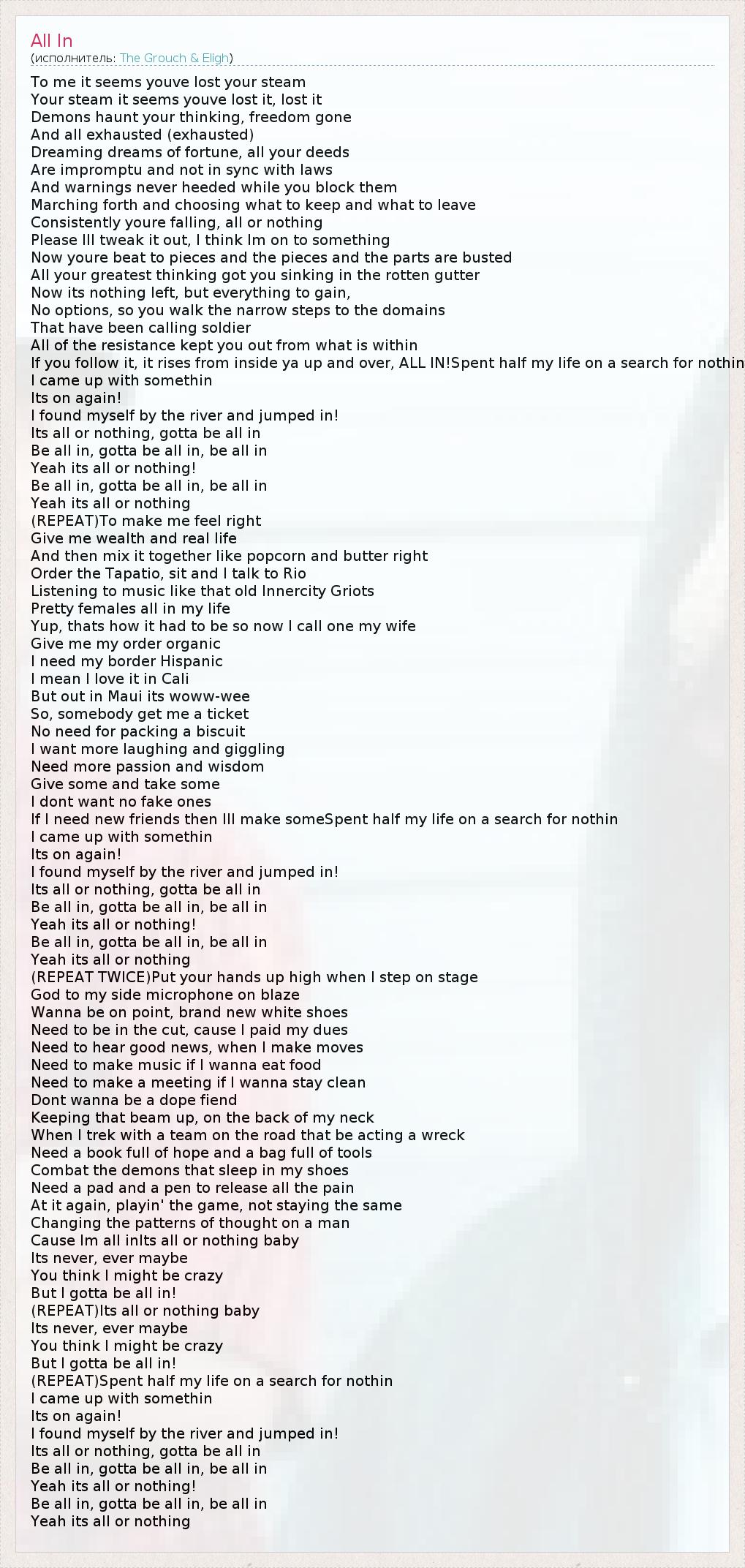 If you follow it, it rises from inside ya up and over, ALL IN!Spent half my life on a search for nothin