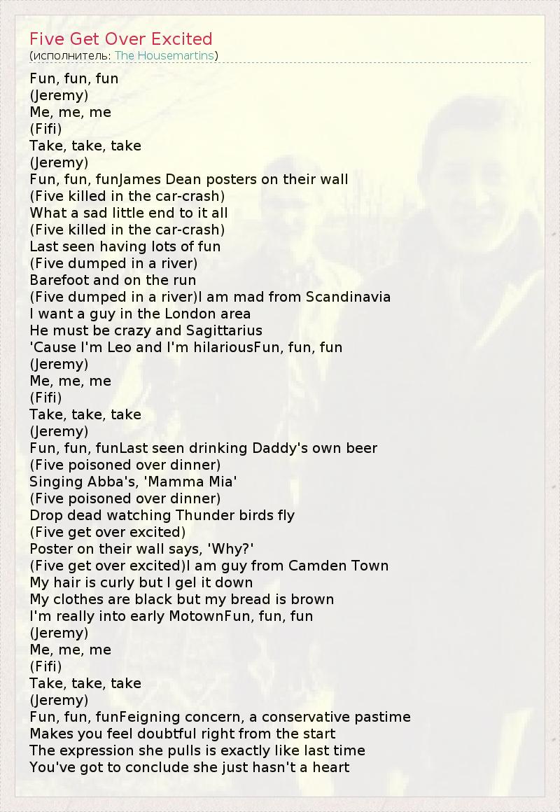 А как ты думаешь, о чем песня "Five Get Over Excited" ?