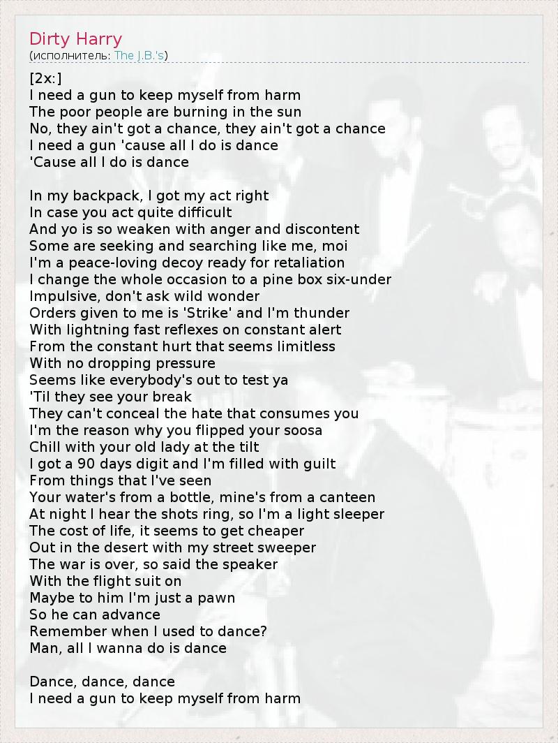 [2x:] I need a gun to keep myself from harm The poor people are burning in the sun No, they ain't got a chance, they ain't got a chance I need a gun 'cause all I do is dance 'Cause all I do is dance In my backpack, I got my act right In case you act quite difficult And yo is so weaken with anger and discontent Some are seeking and searching like me, moi I'm a peace-loving decoy ready for retaliation I change the whole occasion to a pine box six-under Impulsive, don't ask wild wonder Orders given to me is 'Strike' and I'm thunder With lightning fast reflexes on constant alert From the constant hurt that seems limitless With no dropping pressure Seems like everybody's out to test ya 'Til they see your break They can't conceal the hate that consumes you I'm the reason why you flipped your soosa Chill with your old lady at the tilt I got a 90 days digit and I'm filled with guilt From things that I've seen Your water's from a bottle, mine's from a canteen At night I hear the shots ring, so I'm a light sleeper The cost of life, it seems to get cheaper Out in the desert with my street sweeper The war is over, so said the speaker With the flight suit on Maybe to him I'm just a pawn So he can advance Remember when I used to dance? Man, all I wanna do is dance Dance, dance, dance I need a gun to keep myself from harm