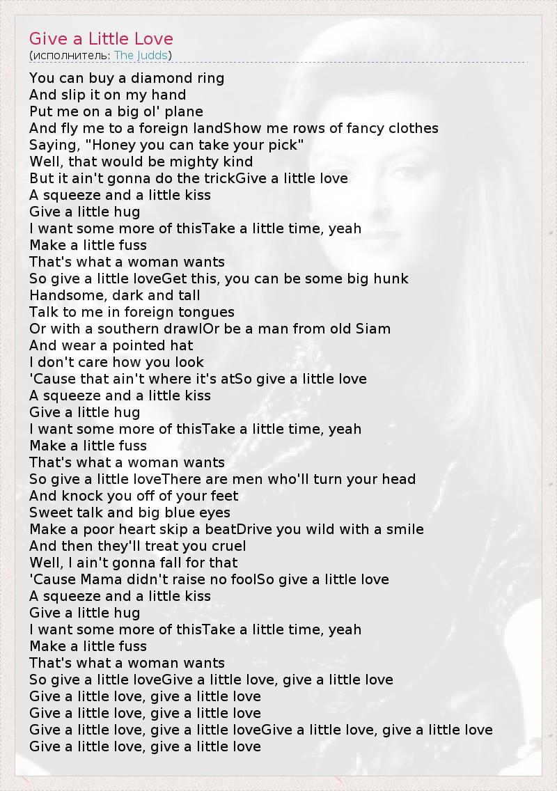 You can buy a diamond ring And slip it on my hand Put me on a big ol' plane And fly me to a foreign landShow me rows of fancy clothes Saying, "Honey you can take your pick" Well, that would be mighty kind But it ain't gonna do the trickGive a little love A squeeze and a little kiss Give a little hug I want some more of thisTake a little time, yeah Make a little fuss That's what a woman wants So give a little loveGet this, you can be some big hunk Handsome, dark and tall Talk to me in foreign tongues Or with a southern drawlOr be a man from old Siam And wear a pointed hat I don't care how you look 'Cause that ain't where it's atSo give a little love A squeeze and a little kiss Give a little hug I want some more of thisTake a little time, yeah Make a little fuss That's what a woman wants So give a little loveThere are men who'll turn your head And knock you off of your feet Sweet talk and big blue eyes Make a poor heart skip a beatDrive you wild with a smile And then they'll treat you cruel Well, I ain't gonna fall for that 'Cause Mama didn't raise no foolSo give a little love A squeeze and a little kiss Give a little hug I want some more of thisTake a little time, yeah Make a little fuss That's what a woman wants So give a little loveGive a little love, give a little love Give a little love, give a little love Give a little love, give a little love Give a little love, give a little loveGive a little love, give a little love Give a little love, give a little love