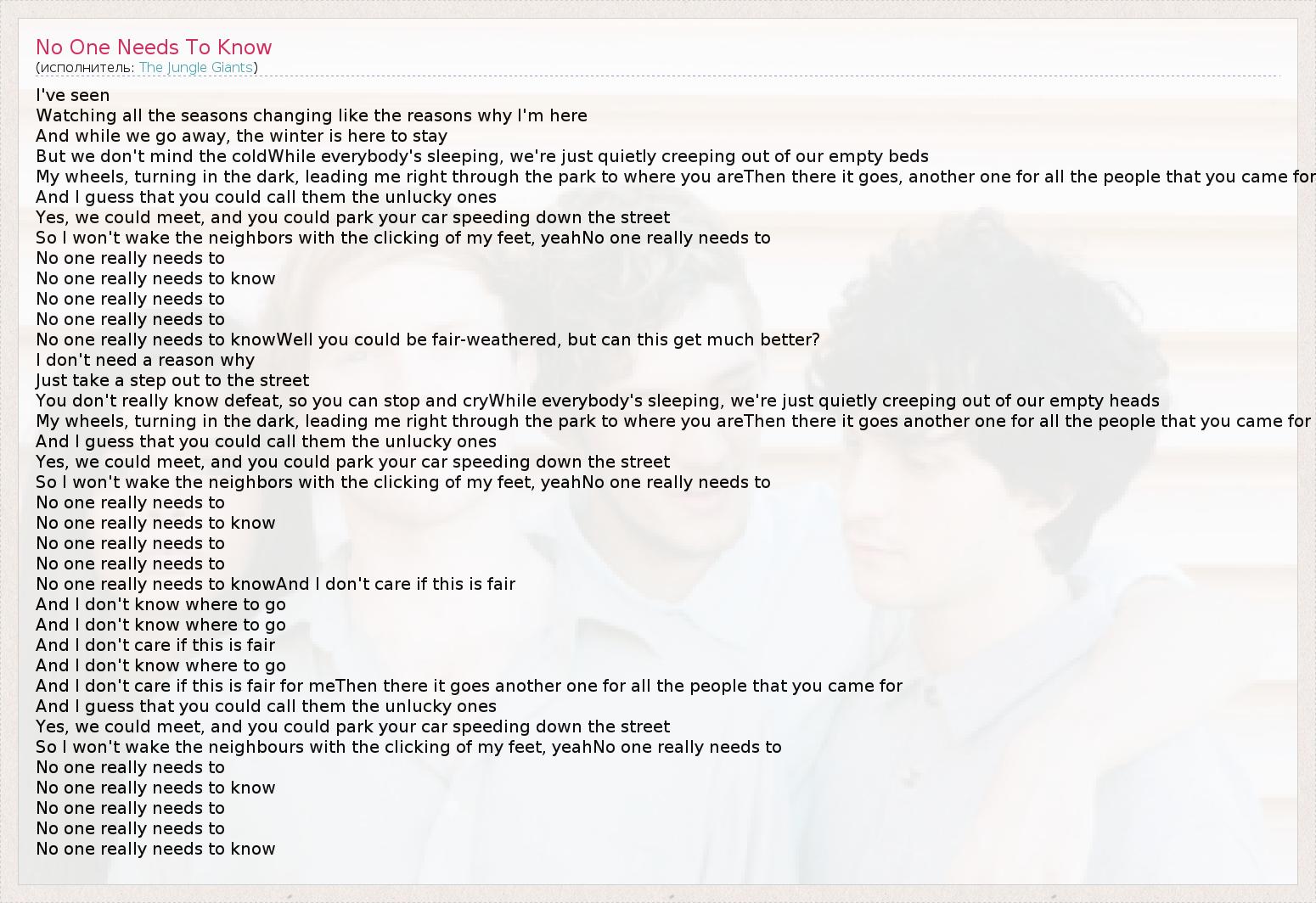 А как ты думаешь, о чем песня "No One Needs To Know" ?