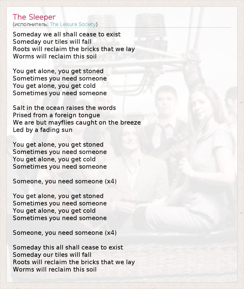 Когда-нибудь мы все будем перестанет существовать Когда-нибудь наши клетки упадет Корни будут вернуть кирпичи, которые мы закладываем Черви будут вернуть эту землю Вы в одиночку, вы получите камнями Иногда вам нужно кого- Вы в одиночку, вы получите холодно Иногда вам нужно кого- Соль в океане поднимает слова Prised от иностранного языка Мы , но поденки поймали на ветру Под руководством увядающей ВС Вы в одиночку, вы получите камнями Иногда вам нужно кого- Вы в одиночку, вы получите холодно Иногда вам нужно кого- Кто-то , что вам нужно кого-то ( x4 ) Вы в одиночку, вы получите камнями Иногда вам нужно кого- Вы в одиночку, вы получите холодно Иногда вам нужно кого- Кто-то , что вам нужно кого-то ( x4 ) Когда-нибудь все это должно перестать существовать Когда-нибудь наши клетки упадет Корни будут вернуть кирпичи, которые мы закладываем Черви будут вернуть эту землю