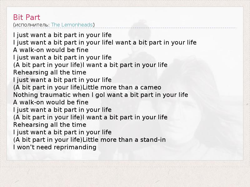 I just want a bit part in your life I just want a bit part in your lifeI want a bit part in your life A walk-on would be fine I just want a bit part in your life (A bit part in your life)I want a bit part in your life Rehearsing all the time I just want a bit part in your life (A bit part in your life)Little more than a cameo Nothing traumatic when I goI want a bit part in your life A walk-on would be fine I just want a bit part in your life (A bit part in your life)I want a bit part in your life Rehearsing all the time I just want a bit part in your life (A bit part in your life)Little more than a stand-in I won't need reprimanding