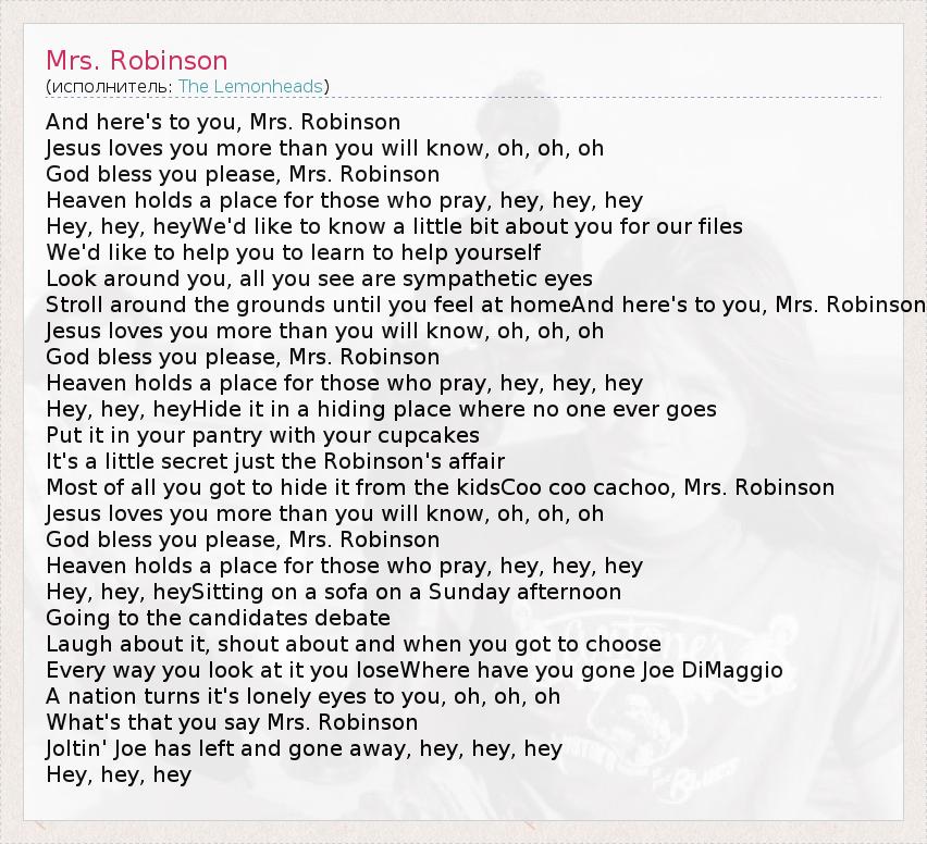 And here's to you, Mrs. Robinson Jesus loves you more than you will know, oh, oh, oh God bless you please, Mrs. Robinson Heaven holds a place for those who pray, hey, hey, hey Hey, hey, heyWe'd like to know a little bit about you for our files We'd like to help you to learn to help yourself Look around you, all you see are sympathetic eyes Stroll around the grounds until you feel at homeAnd here's to you, Mrs. Robinson Jesus loves you more than you will know, oh, oh, oh God bless you please, Mrs. Robinson Heaven holds a place for those who pray, hey, hey, hey Hey, hey, heyHide it in a hiding place where no one ever goes Put it in your pantry with your cupcakes It's a little secret just the Robinson's affair Most of all you got to hide it from the kidsCoo coo cachoo, Mrs. Robinson Jesus loves you more than you will know, oh, oh, oh God bless you please, Mrs. Robinson Heaven holds a place for those who pray, hey, hey, hey Hey, hey, heySitting on a sofa on a Sunday afternoon Going to the candidates debate Laugh about it, shout about and when you got to choose Every way you look at it you loseWhere have you gone Joe DiMaggio A nation turns it's lonely eyes to you, oh, oh, oh What's that you say Mrs. Robinson Joltin' Joe has left and gone away, hey, hey, hey Hey, hey, hey