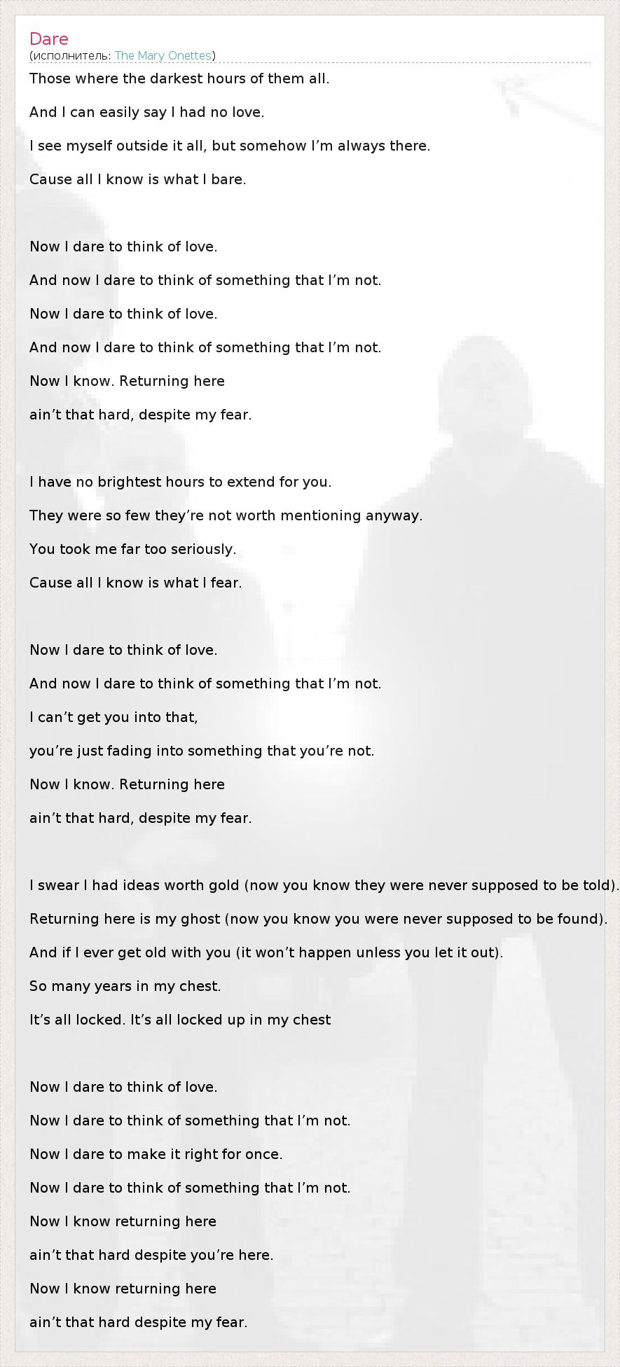 Those where the darkest hours of them all. And I can easily say I had no love. I see myself outside it all, but somehow I’m always there. Cause all I know is what I bare. Now I dare to think of love. And now I dare to think of something that I’m not. Now I dare to think of love. And now I dare to think of something that I’m not. Now I know. Returning here ain’t that hard, despite my fear. I have no brightest hours to extend for you. They were so few they’re not worth mentioning anyway. You took me far too seriously. Cause all I know is what I fear. Now I dare to think of love. And now I dare to think of something that I’m not. I can’t get you into that, you’re just fading into something that you’re not. Now I know. Returning here ain’t that hard, despite my fear. I swear I had ideas worth gold (now you know they were never supposed to be told). Returning here is my ghost (now you know you were never supposed to be found). And if I ever get old with you (it won’t happen unless you let it out). So many years in my chest. It’s all locked. It’s all locked up in my chest Now I dare to think of love. Now I dare to think of something that I’m not. Now I dare to make it right for once. Now I dare to think of something that I’m not. Now I know returning here ain’t that hard despite you’re here. Now I know returning here ain’t that hard despite my fear.