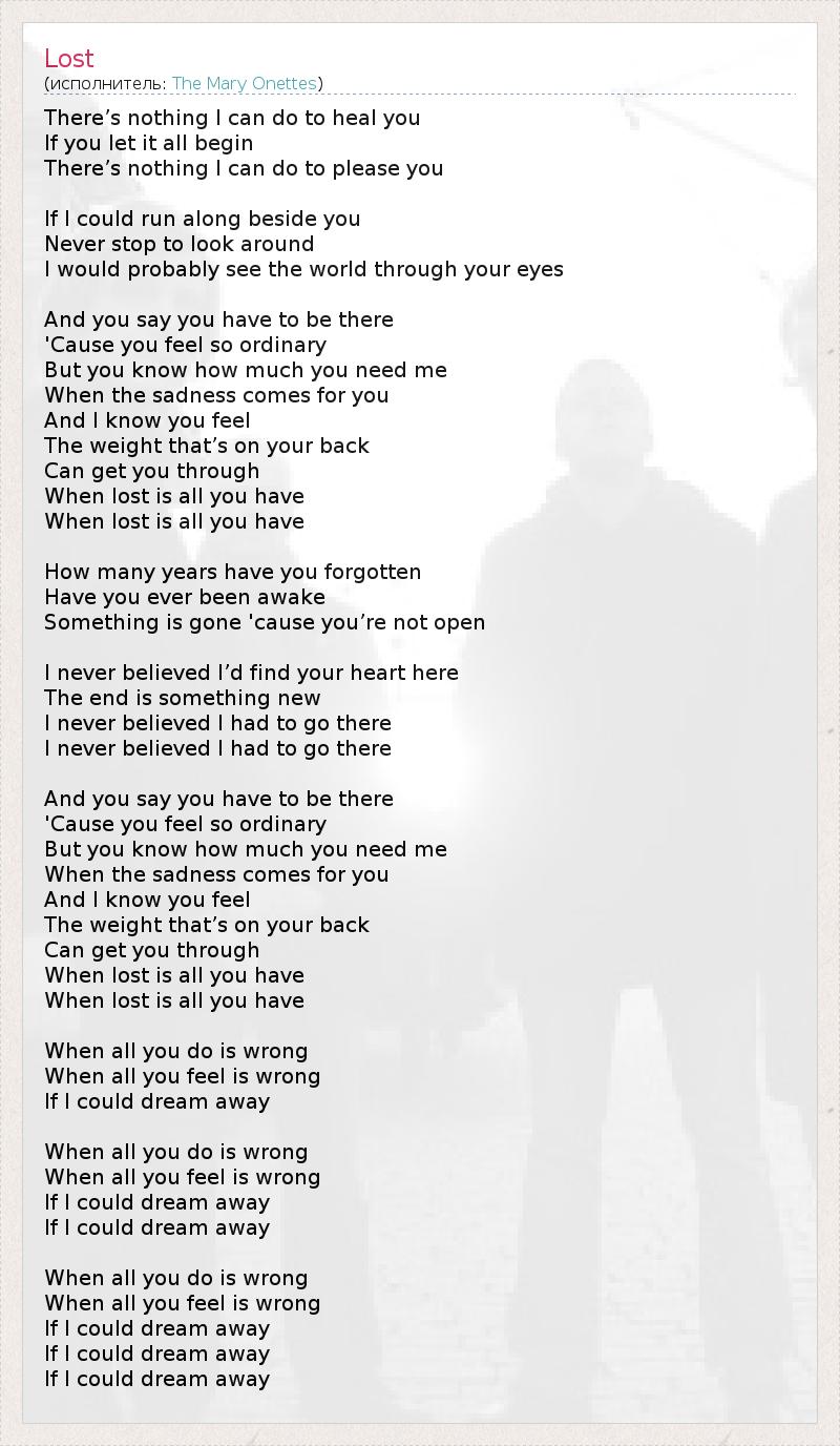 There’s nothing I can do to heal you If you let it all begin There’s nothing I can do to please you If I could run along beside you Never stop to look around I would probably see the world through your eyes And you say you have to be there 'Cause you feel so ordinary But you know how much you need me When the sadness comes for you And I know you feel The weight that’s on your back Can get you through When lost is all you have When lost is all you have How many years have you forgotten Have you ever been awake Something is gone 'cause you’re not open I never believed I’d find your heart here The end is something new I never believed I had to go there I never believed I had to go there And you say you have to be there 'Cause you feel so ordinary But you know how much you need me When the sadness comes for you And I know you feel The weight that’s on your back Can get you through When lost is all you have When lost is all you have When all you do is wrong When all you feel is wrong If I could dream away When all you do is wrong When all you feel is wrong If I could dream away If I could dream away When all you do is wrong When all you feel is wrong If I could dream away If I could dream away If I could dream away