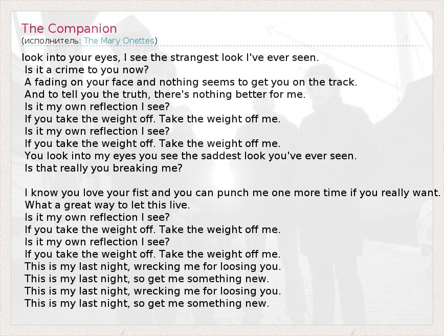 look into your eyes, I see the strangest look I've ever seen. Is it a crime to you now? A fading on your face and nothing seems to get you on the track. And to tell you the truth, there's nothing better for me. Is it my own reflection I see? If you take the weight off. Take the weight off me. Is it my own reflection I see? If you take the weight off. Take the weight off me. You look into my eyes you see the saddest look you've ever seen. Is that really you breaking me? I know you love your fist and you can punch me one more time if you really want. What a great way to let this live. Is it my own reflection I see? If you take the weight off. Take the weight off me. Is it my own reflection I see? If you take the weight off. Take the weight off me. This is my last night, wrecking me for loosing you. This is my last night, so get me something new. This is my last night, wrecking me for loosing you. This is my last night, so get me something new.