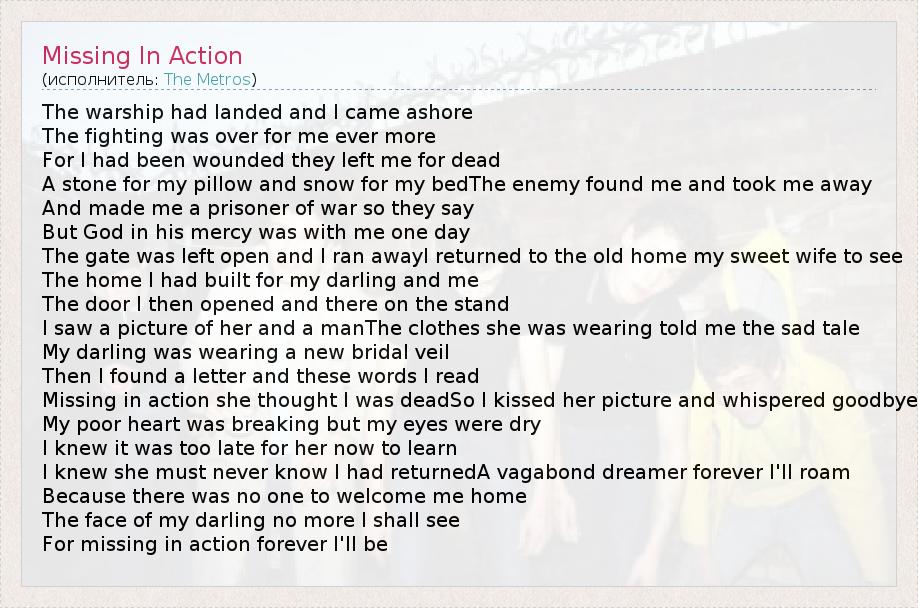 А как ты думаешь, о чем песня "Missing In Action" ?