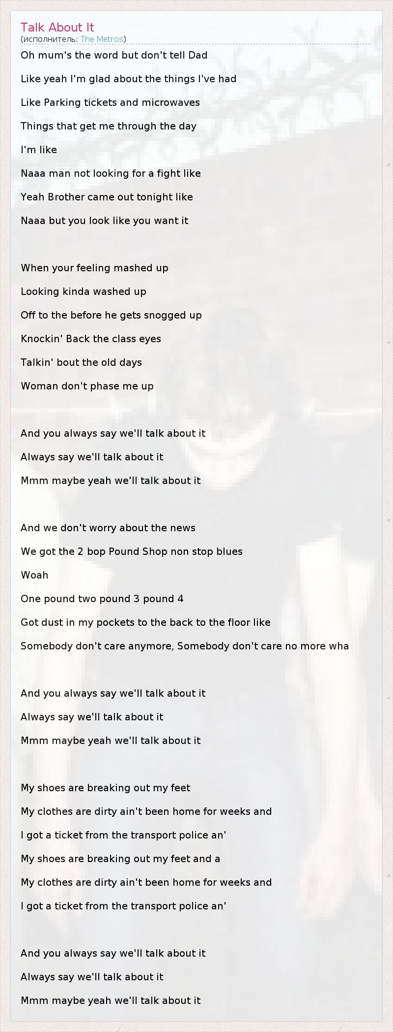 Oh mum's the word but don't tell Dad Like yeah I'm glad about the things I've had Like Parking tickets and microwaves Things that get me through the day I'm like Naaa man not looking for a fight like Yeah Brother came out tonight like Naaa but you look like you want it When your feeling mashed up Looking kinda washed up Off to the before he gets snogged up Knockin' Back the class eyes Talkin' bout the old days Woman don't phase me up And you always say we'll talk about it Always say we'll talk about it Mmm maybe yeah we'll talk about it And we don't worry about the news We got the 2 bop Pound Shop non stop blues Woah One pound two pound 3 pound 4 Got dust in my pockets to the back to the floor like Somebody don't care anymore, Somebody don't care no more wha And you always say we'll talk about it Always say we'll talk about it Mmm maybe yeah we'll talk about it My shoes are breaking out my feet My clothes are dirty ain't been home for weeks and I got a ticket from the transport police an' My shoes are breaking out my feet and a My clothes are dirty ain't been home for weeks and I got a ticket from the transport police an' And you always say we'll talk about it Always say we'll talk about it Mmm maybe yeah we'll talk about it