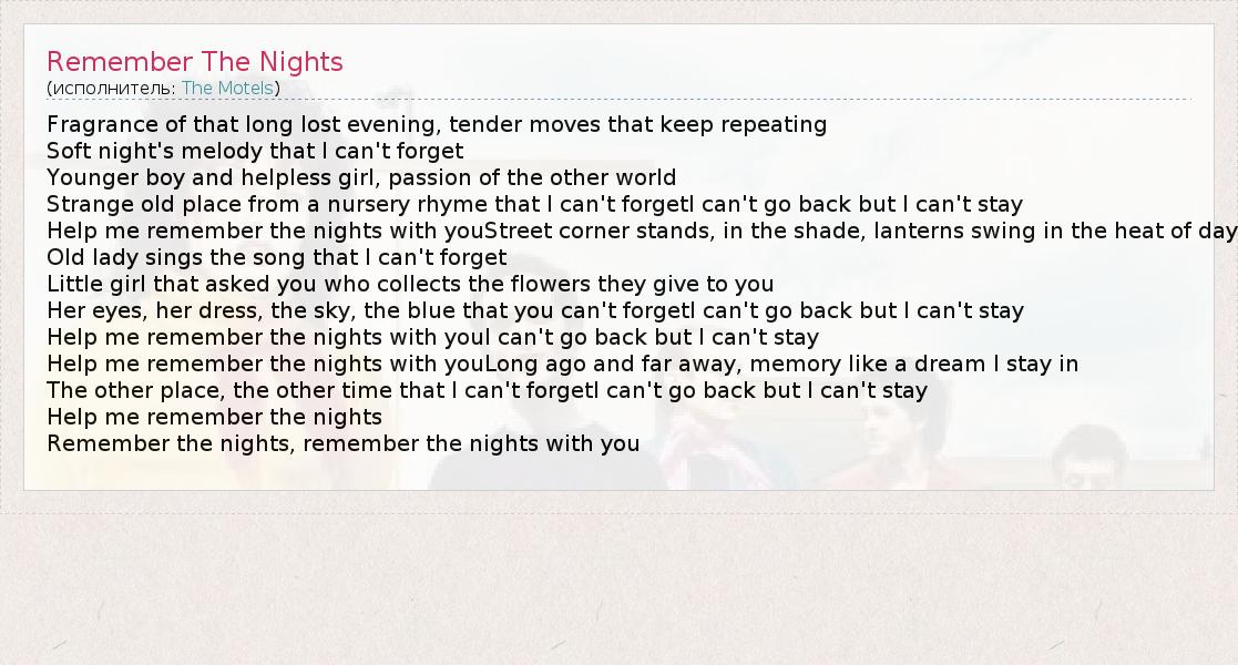 Fragrance of that long lost evening, tender moves that keep repeating Soft night's melody that I can't forget Younger boy and helpless girl, passion of the other world Strange old place from a nursery rhyme that I can't forgetI can't go back but I can't stay Help me remember the nights with youStreet corner stands, in the shade, lanterns swing in the heat of day Old lady sings the song that I can't forget Little girl that asked you who collects the flowers they give to you Her eyes, her dress, the sky, the blue that you can't forgetI can't go back but I can't stay Help me remember the nights with youI can't go back but I can't stay Help me remember the nights with youLong ago and far away, memory like a dream I stay in The other place, the other time that I can't forgetI can't go back but I can't stay Help me remember the nights Remember the nights, remember the nights with you