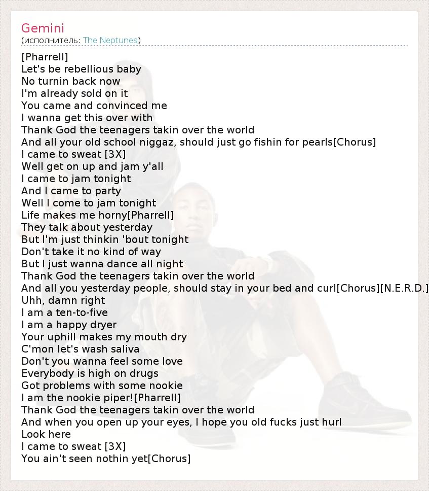 [Pharrell] Let's be rebellious baby No turnin back now I'm already sold on it You came and convinced me I wanna get this over with Thank God the teenagers takin over the world And all your old school niggaz, should just go fishin for pearls[Chorus] I came to sweat [3X] Well get on up and jam y'all I came to jam tonight And I came to party Well I come to jam tonight Life makes me horny[Pharrell] They talk about yesterday But I'm just thinkin 'bout tonight Don't take it no kind of way But I just wanna dance all night Thank God the teenagers takin over the world And all you yesterday people, should stay in your bed and curl[Chorus][N.E.R.D.] Uhh, damn right I am a ten-to-five I am a happy dryer Your uphill makes my mouth dry C'mon let's wash saliva Don't you wanna feel some love Everybody is high on drugs Got problems with some nookie I am the nookie piper![Pharrell] Thank God the teenagers takin over the world And when you open up your eyes, I hope you old fucks just hurl Look here I came to sweat [3X] You ain't seen nothin yet[Chorus]