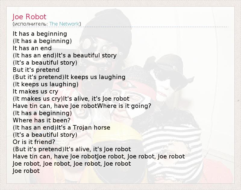 It has a beginning (It has a beginning) It has an end (It has an end)It's a beautiful story (It's a beautiful story) But it's pretend (But it's pretend)It keeps us laughing (It keeps us laughing) It makes us cry (It makes us cry)It's alive, it's Joe robot Have tin can, have Joe robotWhere is it going? (It has a beginning) Where has it been? (It has an end)It's a Trojan horse (It's a beautiful story) Or is it friend? (But it's pretend)It's alive, it's Joe robot Have tin can, have Joe robotJoe robot, Joe robot, Joe robot Joe robot, Joe robot, Joe robot, Joe robot Joe robot