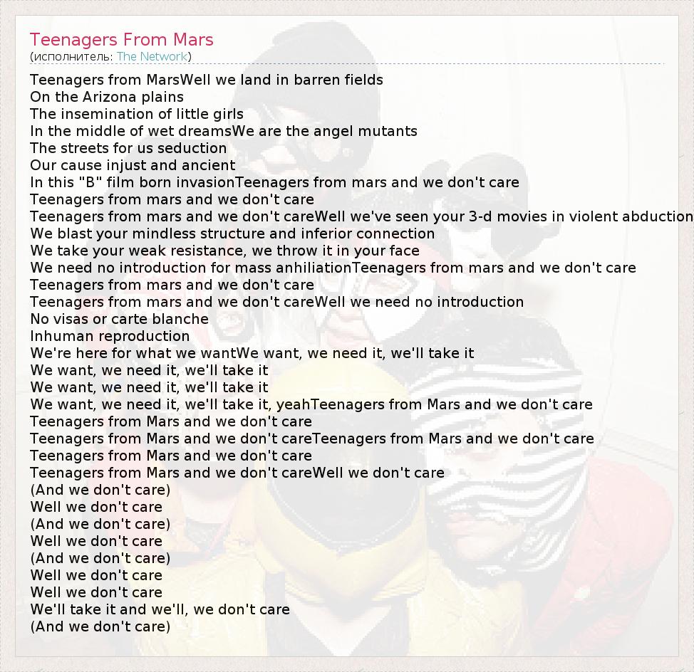 Teenagers from MarsWell we land in barren fields On the Arizona plains The insemination of little girls In the middle of wet dreamsWe are the angel mutants The streets for us seduction Our cause injust and ancient In this "B" film born invasionTeenagers from mars and we don't care Teenagers from mars and we don't care Teenagers from mars and we don't careWell we've seen your 3-d movies in violent abduction We blast your mindless structure and inferior connection We take your weak resistance, we throw it in your face We need no introduction for mass anhiliationTeenagers from mars and we don't care Teenagers from mars and we don't care Teenagers from mars and we don't careWell we need no introduction No visas or carte blanche Inhuman reproduction We're here for what we wantWe want, we need it, we'll take it We want, we need it, we'll take it We want, we need it, we'll take it We want, we need it, we'll take it, yeahTeenagers from Mars and we don't care Teenagers from Mars and we don't care Teenagers from Mars and we don't careTeenagers from Mars and we don't care Teenagers from Mars and we don't care Teenagers from Mars and we don't careWell we don't care (And we don't care) Well we don't care (And we don't care) Well we don't care (And we don't care) Well we don't care Well we don't care We'll take it and we'll, we don't care (And we don't care)
