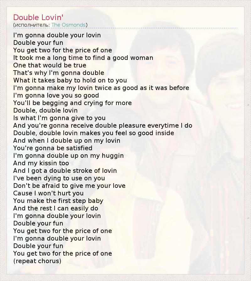 I'm gonna double your lovin Double your fun You get two for the price of one It took me a long time to find a good woman One that would be true That's why I'm gonna double What it takes baby to hold on to you I'm gonna make my lovin twice as good as it was before I'm gonna love you so good You'll be begging and crying for more Double, double lovin Is what I'm gonna give to you And you're gonna receive double pleasure everytime I do Double, double lovin makes you feel so good inside And when I double up on my lovin You're gonna be satisfied I'm gonna double up on my huggin And my kissin too And I got a double stroke of lovin I've been dying to use on you Don't be afraid to give me your love Cause I won't hurt you You make the first step baby And the rest I can easily do I'm gonna double your lovin Double your fun You get two for the price of one I'm gonna double your lovin Double your fun You get two for the price of one (repeat chorus)