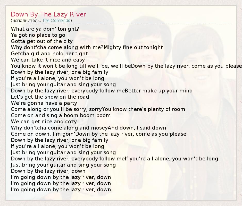 What are ya doin' tonight? Ya got no place to go Gotta get out of the city Why dont'cha come along with me?Mighty fine out tonight Getcha girl and hold her tight We can take it nice and easy You know it won't be long till we'll be, we'll beDown by the lazy river, come as you please Down by the lazy river, one big family If you're all alone, you won't be long Just bring your guitar and sing your song Down by the lazy river, everybody follow meBetter make up your mind Let's get the show on the road We're gonna have a party Come along or you'll be sorry, sorryYou know there's plenty of room Come on and sing a boom boom boom We can get nice and cozy Why don'tcha come along and moseyAnd down, I said down Come on down, I'm goin'Down by the lazy river, come as you please Down by the lazy river, one big family If you're all alone, you won't be long Just bring your guitar and sing your song Down by the lazy river, everybody follow meIf you're all alone, you won't be long Just bring your guitar and sing your song Down by the lazy river, down I'm going down by the lazy river, down I'm going down by the lazy river, down I'm going down by the lazy river, down