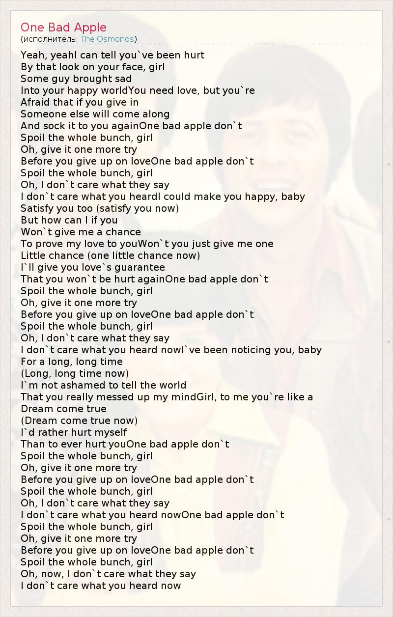 Yeah, yeahI can tell you`ve been hurt By that look on your face, girl Some guy brought sad Into your happy worldYou need love, but you`re Afraid that if you give in Someone else will come along And sock it to you againOne bad apple don`t Spoil the whole bunch, girl Oh, give it one more try Before you give up on loveOne bad apple don`t Spoil the whole bunch, girl Oh, I don`t care what they say I don`t care what you heardI could make you happy, baby Satisfy you too (satisfy you now) But how can I if you Won`t give me a chance To prove my love to youWon`t you just give me one Little chance (one little chance now) I`ll give you love`s guarantee That you won`t be hurt againOne bad apple don`t Spoil the whole bunch, girl Oh, give it one more try Before you give up on loveOne bad apple don`t Spoil the whole bunch, girl Oh, I don`t care what they say I don`t care what you heard nowI`ve been noticing you, baby For a long, long time (Long, long time now) I`m not ashamed to tell the world That you really messed up my mindGirl, to me you`re like a Dream come true (Dream come true now) I`d rather hurt myself Than to ever hurt youOne bad apple don`t Spoil the whole bunch, girl Oh, give it one more try Before you give up on loveOne bad apple don`t Spoil the whole bunch, girl Oh, I don`t care what they say I don`t care what you heard nowOne bad apple don`t Spoil the whole bunch, girl Oh, give it one more try Before you give up on loveOne bad apple don`t Spoil the whole bunch, girl Oh, now, I don`t care what they say I don`t care what you heard now