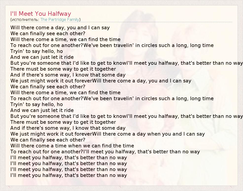 Will there come a day, you and I can say We can finally see each other? Will there come a time, we can find the time To reach out for one another?We've been travelin' in circles such a long, long time Tryin' to say hello, ho And we can just let it ride But you're someone that I'd like to get to knowI'll meet you halfway, that's better than no way There must be some way to get it together And if there's some way, I know that some day We just might work it out foreverWill there come a day, you and I can say We can finally see each other? Will there come a time, we can find the time To reach out for one another?We've been travelin' in circles such a long, long time Tryin' to say hello, ho And we can just let it ride But you're someone that I'd like to get to knowI'll meet you halfway, that's better than no way There must be some way to get it together And if there's some way, I know that some day We just might work it out foreverWill there come a day when you and I can say We can finally see each other? Will there come a time when we can find the time To reach out for one another?I'll meet you halfway, that's better than no way I'll meet you halfway, that's better than no way I'll meet you halfway, that's better than no way I'll meet you halfway, that's better than no way I'll meet you halfway, that's better than no way