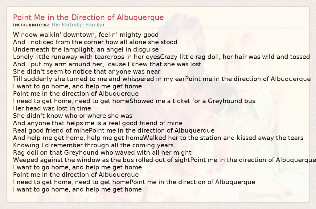Window walkin' downtown, feelin' mighty good And I noticed from the corner how all alone she stood Underneath the lamplight, an angel in disguise Lonely little runaway with teardrops in her eyesCrazy little rag doll, her hair was wild and tossed And I put my arm around her, 'cause I knew that she was lost She didn't seem to notice that anyone was near Till suddenly she turned to me and whispered in my earPoint me in the direction of Albuquerque I want to go home, and help me get home Point me in the direction of Albuquerque I need to get home, need to get homeShowed me a ticket for a Greyhound bus Her head was lost in time She didn't know who or where she was And anyone that helps me is a real good friend of mine Real good friend of minePoint me in the direction of Albuquerque And help me get home, help me get homeWalked her to the station and kissed away the tears Knowing I'd remember through all the coming years Rag doll on that Greyhound who waved with all her might Weeped against the window as the bus rolled out of sightPoint me in the direction of Albuquerque I want to go home, and help me get home Point me in the direction of Albuquerque I need to get home, need to get homePoint me in the direction of Albuquerque I want to go home, and help me get home