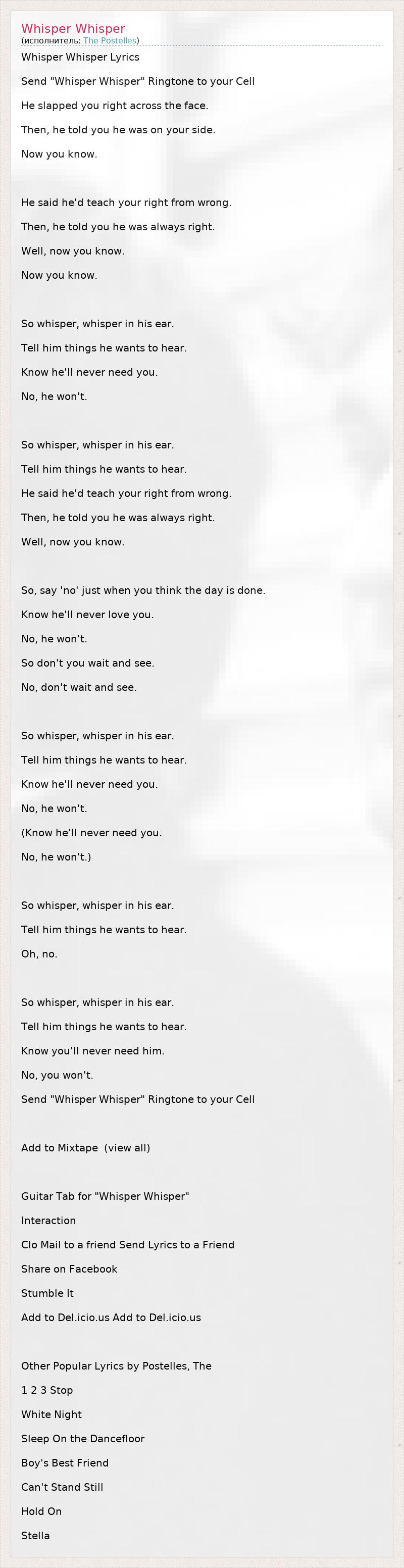 Whisper Whisper Lyrics Send "Whisper Whisper" Ringtone to your Cell He slapped you right across the face. Then, he told you he was on your side. Now you know. He said he'd teach your right from wrong. Then, he told you he was always right. Well, now you know. Now you know. So whisper, whisper in his ear. Tell him things he wants to hear. Know he'll never need you. No, he won't. So whisper, whisper in his ear. Tell him things he wants to hear. He said he'd teach your right from wrong. Then, he told you he was always right. Well, now you know. So, say 'no' just when you think the day is done. Know he'll never love you. No, he won't. So don't you wait and see. No, don't wait and see. So whisper, whisper in his ear. Tell him things he wants to hear. Know he'll never need you. No, he won't. (Know he'll never need you. No, he won't.) So whisper, whisper in his ear. Tell him things he wants to hear. Oh, no. So whisper, whisper in his ear. Tell him things he wants to hear. Know you'll never need him. No, you won't. Send "Whisper Whisper" Ringtone to your Cell Add to Mixtape (view all) Guitar Tab for "Whisper Whisper" Interaction Clo Mail to a friend Send Lyrics to a Friend Share on Facebook Stumble It Add to Del.icio.us Add to Del.icio.us Other Popular Lyrics by Postelles, The 1 2 3 Stop White Night Sleep On the Dancefloor Boy's Best Friend Can't Stand Still Hold On Stella