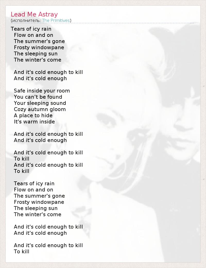 Tears of icy rain Flow on and on The summer's gone Frosty windowpane The sleeping sun The winter's come And it's cold enough to kill And it's cold enough Safe inside your room You can't be found Your sleeping sound Cozy autumn gloom A place to hide It's warm inside And it's cold enough to kill And it's cold enough And it's cold enough to kill To kill And it's cold enough to kill To kill Tears of icy rain Flow on and on The summer's gone Frosty windowpane The sleeping sun The winter's come And it's cold enough to kill And it's cold enough And it's cold enough to kill To kill