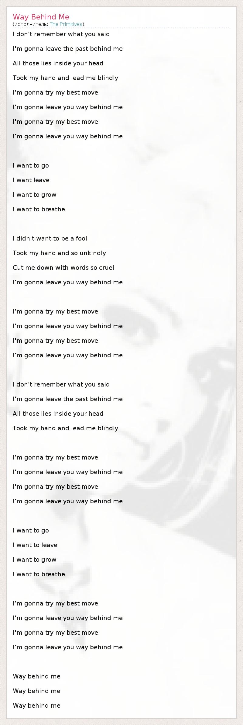 I don't remember what you said I'm gonna leave the past behind me All those lies inside your head Took my hand and lead me blindly I'm gonna try my best move I'm gonna leave you way behind me I'm gonna try my best move I'm gonna leave you way behind me I want to go I want leave I want to grow I want to breathe I didn't want to be a fool Took my hand and so unkindly Cut me down with words so cruel I'm gonna leave you way behind me I'm gonna try my best move I'm gonna leave you way behind me I'm gonna try my best move I'm gonna leave you way behind me I don't remember what you said I'm gonna leave the past behind me All those lies inside your head Took my hand and lead me blindly I'm gonna try my best move I'm gonna leave you way behind me I'm gonna try my best move I'm gonna leave you way behind me I want to go I want to leave I want to grow I want to breathe I'm gonna try my best move I'm gonna leave you way behind me I'm gonna try my best move I'm gonna leave you way behind me Way behind me Way behind me Way behind me