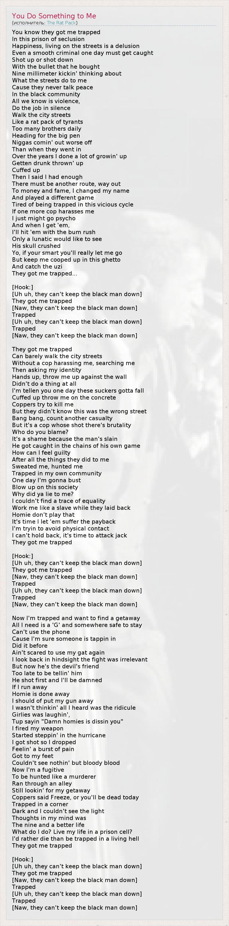 You know they got me trapped In this prison of seclusion Happiness, living on the streets is a delusion Even a smooth criminal one day must get caught Shot up or shot down With the bullet that he bought Nine millimeter kickin' thinking about What the streets do to me Cause they never talk peace In the black community All we know is violence, Do the job in silence Walk the city streets Like a rat pack of tyrants Too many brothers daily Heading for the big pen Niggas comin' out worse off Than when they went in Over the years I done a lot of growin' up Getten drunk thrown' up Cuffed up Then I said I had enough There must be another route, way out To money and fame, I changed my name And played a different game Tired of being trapped in this vicious cycle If one more cop harasses me I just might go psycho And when I get 'em, I'll hit 'em with the bum rush Only a lunatic would like to see His skull crushed Yo, if your smart you'll really let me go But keep me cooped up in this ghetto And catch the uzi They got me trapped... [Hook:] [Uh uh, they can't keep the black man down] They got me trapped [Naw, they can't keep the black man down] Trapped [Uh uh, they can't keep the black man down] Trapped [Naw, they can't keep the black man down] They got me trapped Can barely walk the city streets Without a cop harassing me, searching me Then asking my identity Hands up, throw me up against the wall Didn't do a thing at all I'm tellen you one day these suckers gotta fall Cuffed up throw me on the concrete Coppers try to kill me But they didn't know this was the wrong street Bang bang, count another casualty But it's a cop whose shot there's brutality Who do you blame? It's a shame because the man's slain He got caught in the chains of his own game How can I feel guilty After all the things they did to me Sweated me, hunted me Trapped in my own community One day I'm gonna bust Blow up on this society Why did ya lie to me? I couldn't find a trace of equality Work me like a slave while they laid back Homie don't play that It's time I let 'em suffer the payback I'm tryin to avoid physical contact I can't hold back, it's time to attack jack They got me trapped [Hook:] [Uh uh, they can't keep the black man down] They got me trapped [Naw, they can't keep the black man down] Trapped [Uh uh, they can't keep the black man down] Trapped [Naw, they can't keep the black man down] Now I'm trapped and want to find a getaway All I need is a 'G' and somewhere safe to stay Can't use the phone Cause I'm sure someone is tappin in Did it before Ain't scared to use my gat again I look back in hindsight the fight was irrelevant But now he's the devil's friend Too late to be tellin' him He shot first and I'll be damned If I run away Homie is done away I should of put my gun away I wasn't thinkin' all I heard was the ridicule Girlies was laughin', Tup sayin "Damn homies is dissin you" I fired my weapon Started steppin' in the hurricane I got shot so I dropped Feelin' a burst of pain Got to my feet Couldn't see nothin' but bloody blood Now I'm a fugitive To be hunted like a murderer Ran through an alley Still lookin' for my getaway Coppers said Freeze, or you'll be dead today Trapped in a corner Dark and I couldn't see the light Thoughts in my mind was The nine and a better life What do I do? Live my life in a prison cell? I'd rather die than be trapped in a living hell They got me trapped [Hook:] [Uh uh, they can't keep the black man down] They got me trapped [Naw, they can't keep the black man down] Trapped [Uh uh, they can't keep the black man down] Trapped [Naw, they can't keep the black man down]