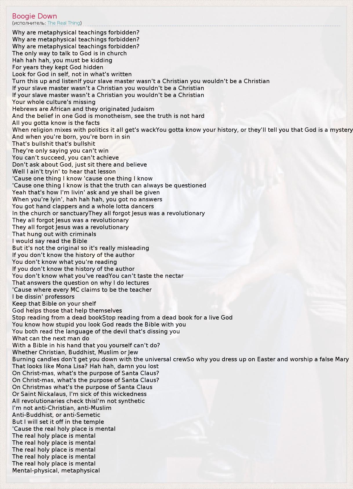 Why are metaphysical teachings forbidden? Why are metaphysical teachings forbidden? Why are metaphysical teachings forbidden? The only way to talk to God is in church Hah hah hah, you must be kidding For years they kept God hidden Look for God in self, not in what's written Turn this up and listenIf your slave master wasn't a Christian you wouldn't be a Christian If your slave master wasn't a Christian you wouldn't be a Christian If your slave master wasn't a Christian you wouldn't be a Christian Your whole culture's missing Hebrews are African and they originated Judaism And the belief in one God is monotheism, see the truth is not hard All you gotta know is the facts When religion mixes with politics it all get's wackYou gotta know your history, or they'll tell you that God is a mystery And when you're born, you're born in sin That's bullshit that's bullshit They're only saying you can't win You can't succeed, you can't achieve Don't ask about God, just sit there and believe Well I ain't tryin' to hear that lesson 'Cause one thing I know 'cause one thing I know 'Cause one thing I know is that the truth can always be questioned Yeah that's how I'm livin' ask and ye shall be given When you're lyin', hah hah hah, you got no answers You got hand clappers and a whole lotta dancers In the church or sanctuaryThey all forgot Jesus was a revolutionary They all forgot Jesus was a revolutionary They all forgot Jesus was a revolutionary That hung out with criminals I would say read the Bible But it's not the original so it's really misleading If you don't know the history of the author You don't know what you're reading If you don't know the history of the author You don't know what you've readYou can't taste the nectar That answers the question on why I do lectures 'Cause where every MC claims to be the teacher I be dissin' professors Keep that Bible on your shelf God helps those that help themselves Stop reading from a dead bookStop reading from a dead book for a live God You know how stupid you look God reads the Bible with you You both read the language of the devil that's dissing you What can the next man do With a Bible in his hand that you yourself can't do? Whether Christian, Buddhist, Muslim or Jew Burning candles don't get you down with the universal crewSo why you dress up on Easter and worship a false Mary That looks like Mona Lisa? Hah hah, damn you lost On Christ-mas, what's the purpose of Santa Claus? On Christ-mas, what's the purpose of Santa Claus? On Christmas what's the purpose of Santa Claus Or Saint Nickalaus, I'm sick of this wickedness All revolutionaries check thisI'm not synthetic I'm not anti-Christian, anti-Muslim Anti-Buddhist, or anti-Semetic But I will set it off in the temple 'Cause the real holy place is mental The real holy place is mental The real holy place is mental The real holy place is mental The real holy place is mental The real holy place is mental Mental-physical, metaphysical