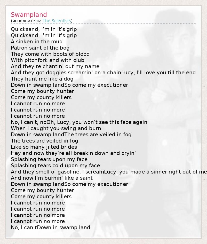 Quicksand, I'm in it's grip Quicksand, I'm in it's grip A sinken in the mud Patron saint of the bog They come with boots of blood With pitchfork and with club And they're chantin' out my name And they got doggies screamin' on a chainLucy, I'll love you till the end They hunt me like a dog Down in swamp landSo come my executioner Come my bounty hunter Come my county killers I cannot run no more I cannot run no more I cannot run no more No, I can't, noOh, Lucy, you won't see this face again When I caught you swing and burn Down in swamp landThe trees are veiled in fog The trees are veiled in fog Like so many jilted brides Hey and now they're all breakin down and cryin' Splashing tears upon my face Splashing tears cold upon my face And they smell of gasoline, I screamLucy, you made a sinner right out of me And now I'm burnin' like a saint Down in swamp landSo come my executioner Come my bounty hunter Come my county killers I cannot run no more I cannot run no more I cannot run no more I cannot run no more No, I can'tDown in swamp land