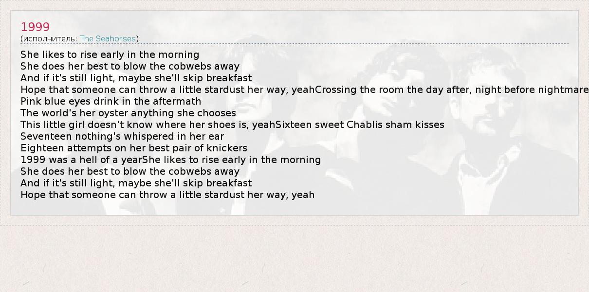 Это интересно:The Seahorses - проект бывшего гитариста The Stone Roses, Джона Сквайра. В отличие от "Роз" их музыка уходит корнями в британский блюз - рок и звучит более "утяжелено". Название группы является ангиограммой к фразе "He Hates Roses". Дебютный, и единственный альбом группы - "Do It Yourself" ("Сделай это сам") вышел в 1997 году, заняв вторую строчку британского чарта. В январе 1999-го коллектив... продолжение