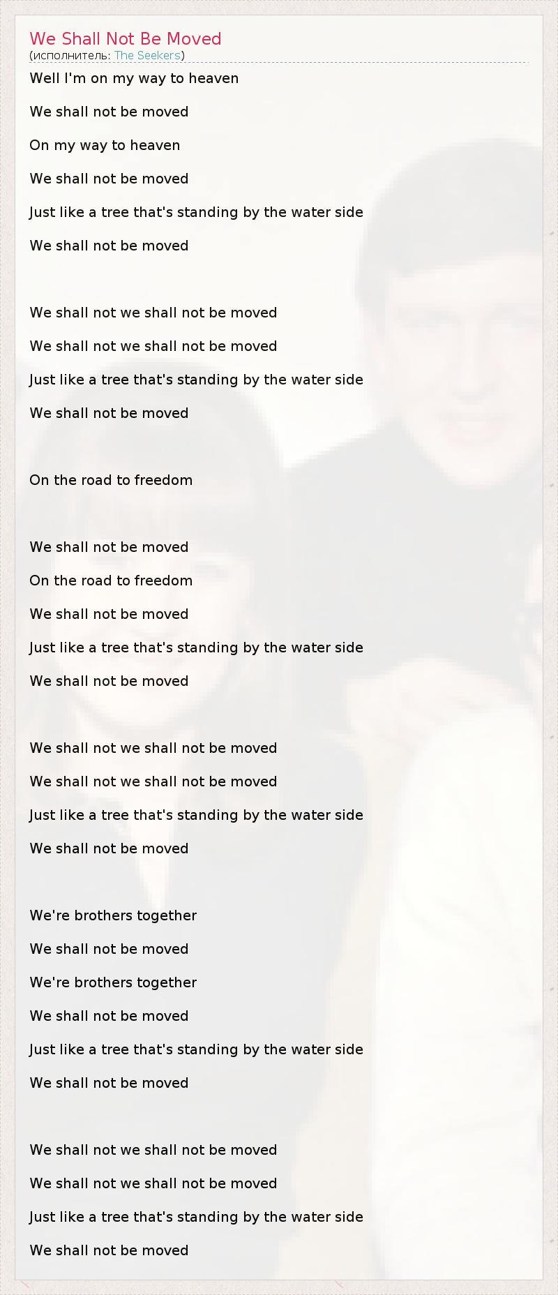 Well I'm on my way to heaven We shall not be moved On my way to heaven We shall not be moved Just like a tree that's standing by the water side We shall not be moved We shall not we shall not be moved We shall not we shall not be moved Just like a tree that's standing by the water side We shall not be moved On the road to freedom We shall not be moved On the road to freedom We shall not be moved Just like a tree that's standing by the water side We shall not be moved We shall not we shall not be moved We shall not we shall not be moved Just like a tree that's standing by the water side We shall not be moved We're brothers together We shall not be moved We're brothers together We shall not be moved Just like a tree that's standing by the water side We shall not be moved We shall not we shall not be moved We shall not we shall not be moved Just like a tree that's standing by the water side We shall not be moved