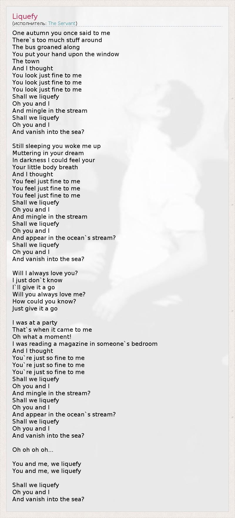 One autumn you once said to me There`s too much stuff around The bus groaned along You put your hand upon the window The town And I thought You look just fine to me You look just fine to me You look just fine to me Shall we liquefy Oh you and I And mingle in the stream Shall we liquefy Oh you and I And vanish into the sea? Still sleeping you woke me up Muttering in your dream In darkness I could feel your Your little body breath And I thought You feel just fine to me You feel just fine to me You feel just fine to me Shall we liquefy Oh you and I And mingle in the stream Shall we liquefy Oh you and I And appear in the ocean`s stream? Shall we liquefy Oh you and I And vanish into the sea? Will I always love you? I just don`t know I`ll give it a go Will you always love me? How could you know? Just give it a go I was at a party That`s when it came to me Oh what a moment! I was reading a magazine in someone`s bedroom And I thought You`re just so fine to me You`re just so fine to me You`re just so fine to me Shall we liquefy Oh you and I And mingle in the stream? Shall we liquefy Oh you and I And appear in the ocean`s stream? Shall we liquefy Oh you and I And vanish into the sea? Oh oh oh oh... You and me, we liquefy You and me, we liquefy Shall we liquefy Oh you and I And vanish into the sea?