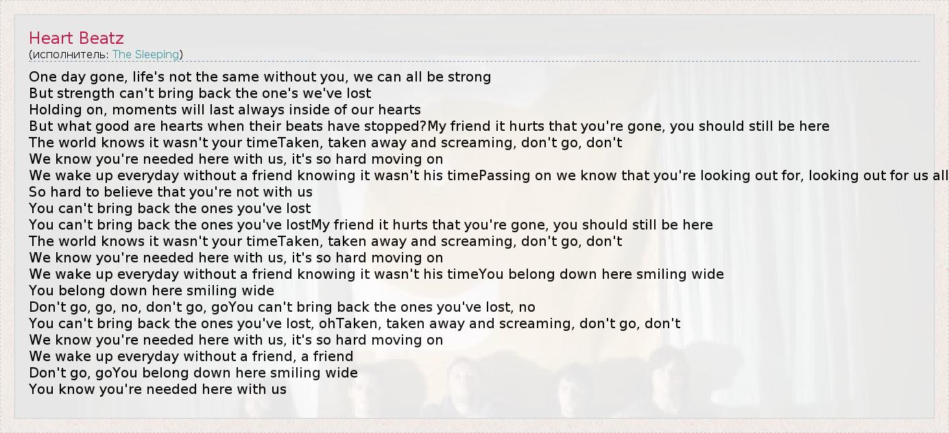 One day gone, life's not the same without you, we can all be strong But strength can't bring back the one's we've lost Holding on, moments will last always inside of our hearts But what good are hearts when their beats have stopped?My friend it hurts that you're gone, you should still be here The world knows it wasn't your timeTaken, taken away and screaming, don't go, don't We know you're needed here with us, it's so hard moving on We wake up everyday without a friend knowing it wasn't his timePassing on we know that you're looking out for, looking out for us all So hard to believe that you're not with us You can't bring back the ones you've lost You can't bring back the ones you've lostMy friend it hurts that you're gone, you should still be here The world knows it wasn't your timeTaken, taken away and screaming, don't go, don't We know you're needed here with us, it's so hard moving on We wake up everyday without a friend knowing it wasn't his timeYou belong down here smiling wide You belong down here smiling wide Don't go, go, no, don't go, goYou can't bring back the ones you've lost, no You can't bring back the ones you've lost, ohTaken, taken away and screaming, don't go, don't We know you're needed here with us, it's so hard moving on We wake up everyday without a friend, a friend Don't go, goYou belong down here smiling wide You know you're needed here with us