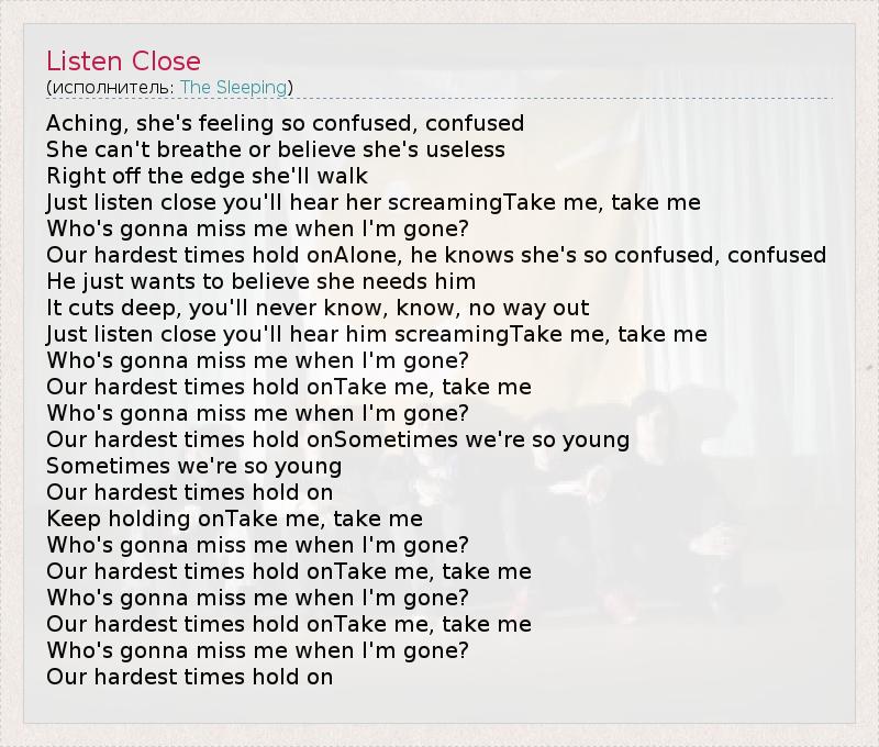 Aching, she's feeling so confused, confused She can't breathe or believe she's useless Right off the edge she'll walk Just listen close you'll hear her screamingTake me, take me Who's gonna miss me when I'm gone? Our hardest times hold onAlone, he knows she's so confused, confused He just wants to believe she needs him It cuts deep, you'll never know, know, no way out Just listen close you'll hear him screamingTake me, take me Who's gonna miss me when I'm gone? Our hardest times hold onTake me, take me Who's gonna miss me when I'm gone? Our hardest times hold onSometimes we're so young Sometimes we're so young Our hardest times hold on Keep holding onTake me, take me Who's gonna miss me when I'm gone? Our hardest times hold onTake me, take me Who's gonna miss me when I'm gone? Our hardest times hold onTake me, take me Who's gonna miss me when I'm gone? Our hardest times hold on